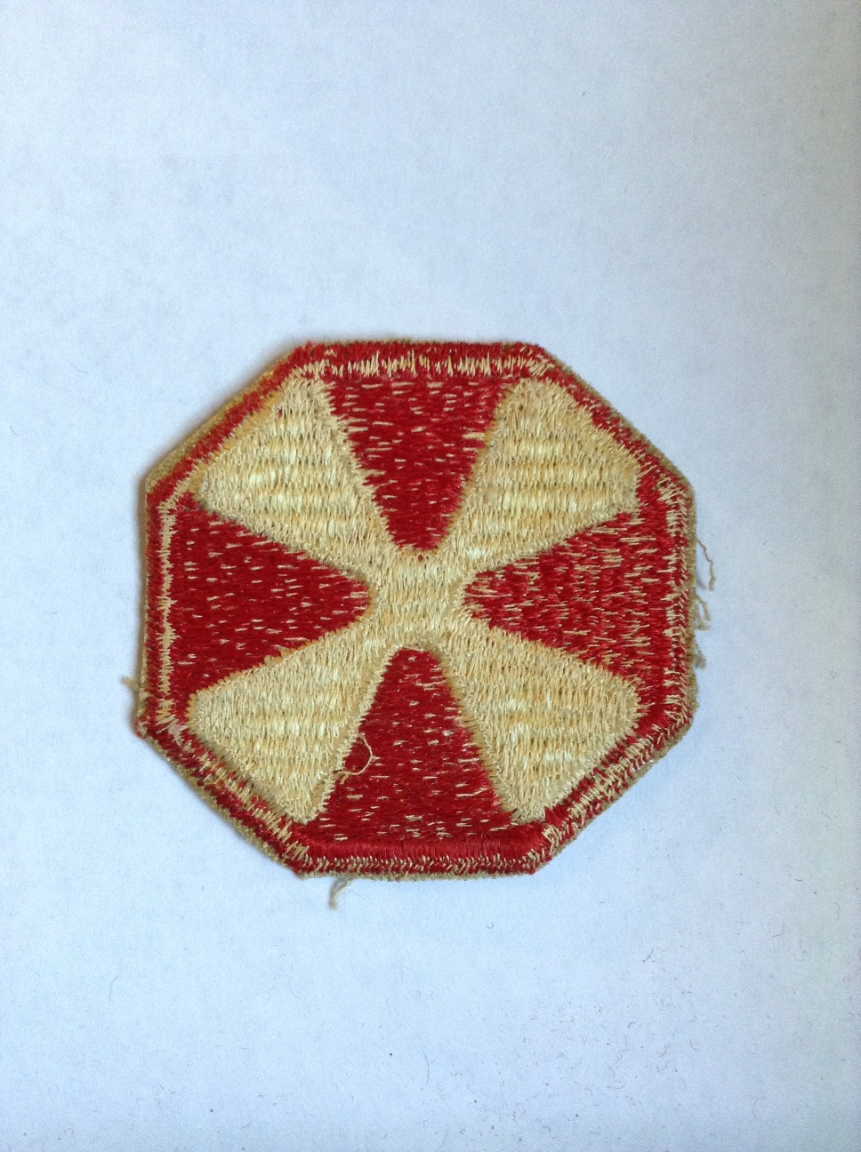 On a red octagon 2 1/4 inches in width and height with each side 1 inch in length, a white cross pattee throughout saltirewise with rounded corners, all within a 1/8 inch red border. The overall dimensions are 2 3/8 inches in width and height.
