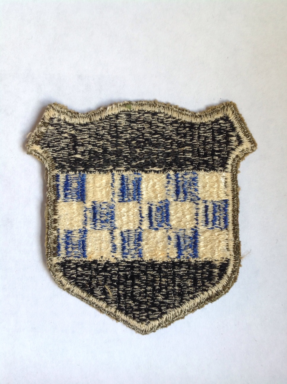 A shield 2 1/2 inches (6.35cm) in height, Sable a fess chequy Argent and Azure, all within a 1/8 inch (.32cm) green border.