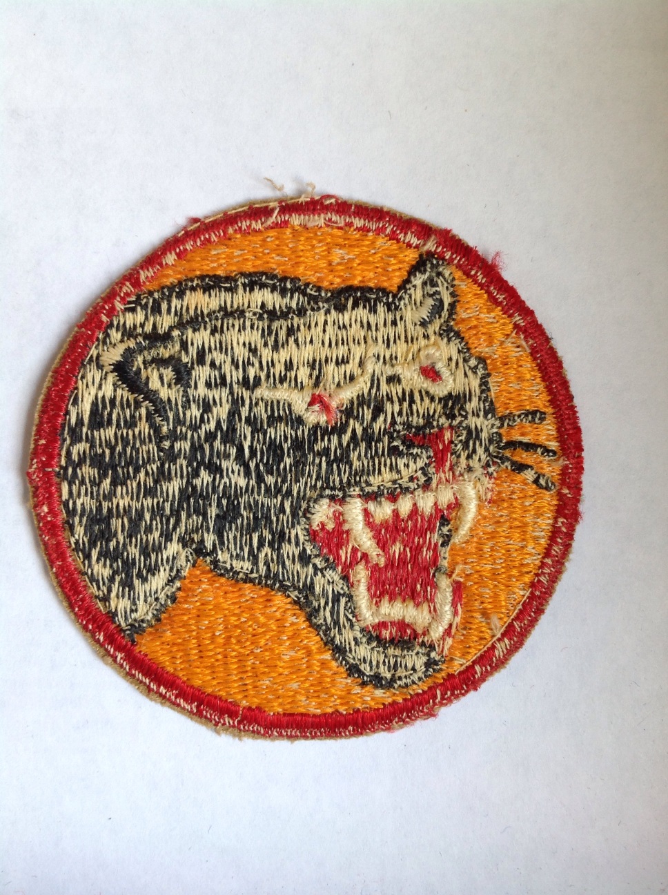 On a golden orange disc 2 3/4 inches (6.99 cm) in diameter charged with the head of a black panther three-quarter view, with red month, tongue, and nose tip, three black whiskers, white teeth, and white eyes and red pupils; all within a 1/8 inch (.32 cm) red border.