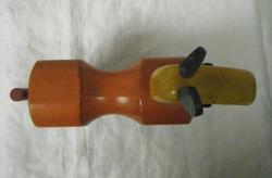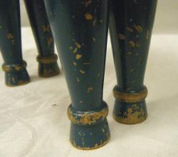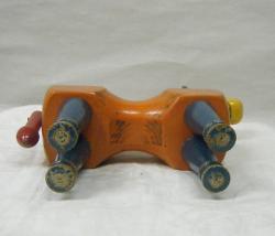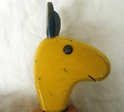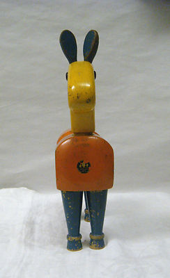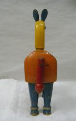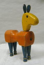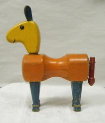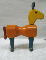 | Description | As seen in the 1935 catalog, this wooden donkey comes apart with both slotted pegs and threads. The threads are, unusually for Holgate, stamped sheet metal nailed to the holds/pegs. Tail is nailed to its peg, unlike in the earlier Holgate #719 "Peggity" or "Donkey Peg" (could be a later repair). Known as "Peggity" in the 1934 catalog. Predominantly black with gold pre-USA decal to chest (dt4a). |