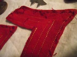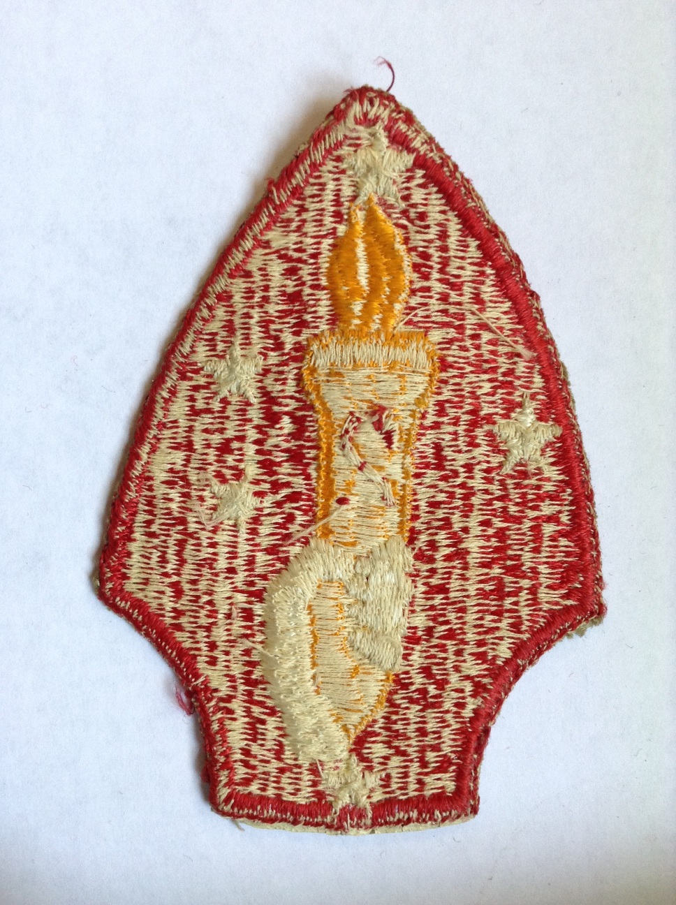 A worn 2d Division shoulder patch, variation with the torch handle thicker than the torch itself. Red "2" is very thin, possibly unfinished. About 50% white-back.