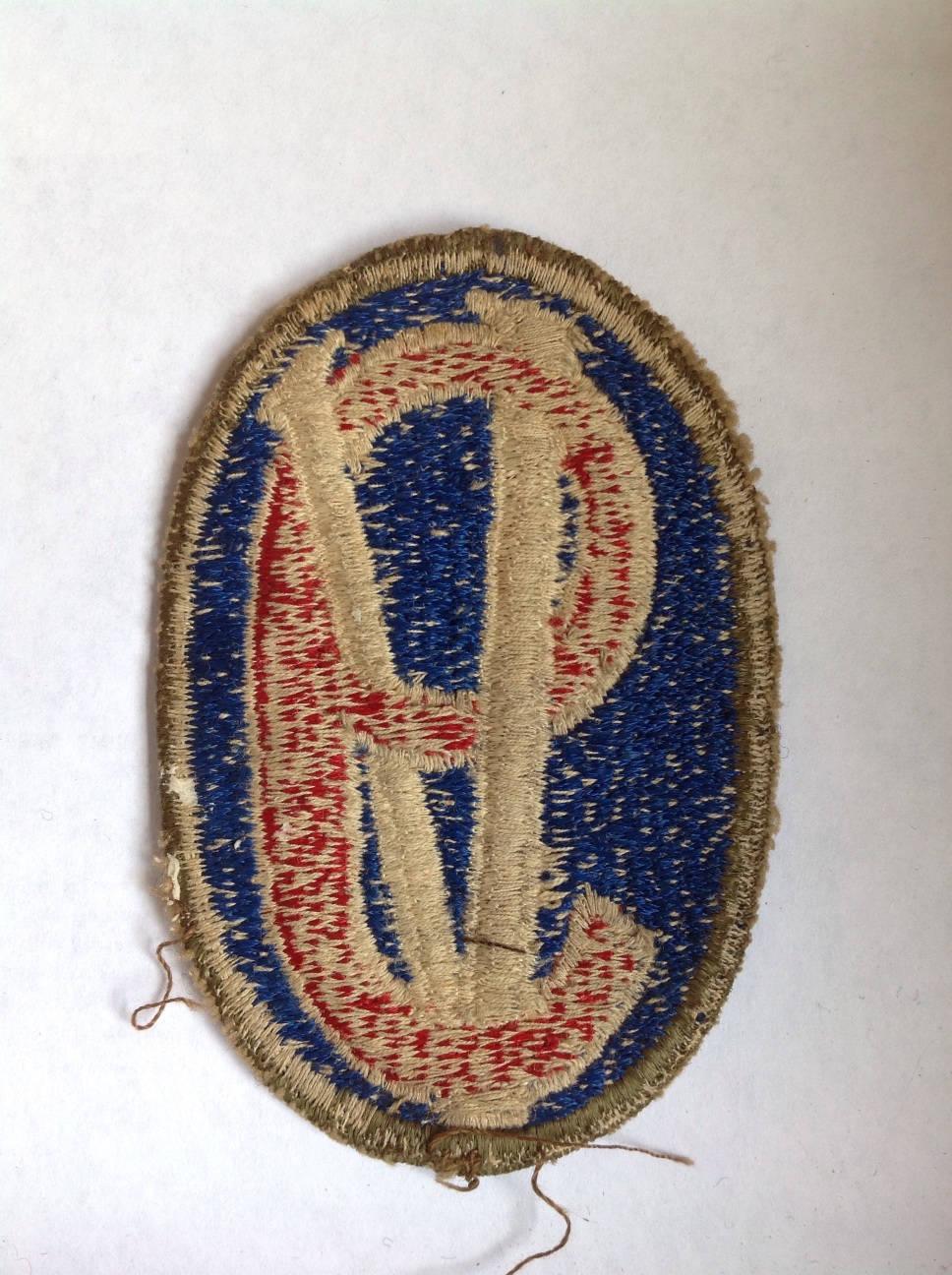 OD-bordered blue oval with intertwined white-bordered-"9" and white "V". OD thread remnants.