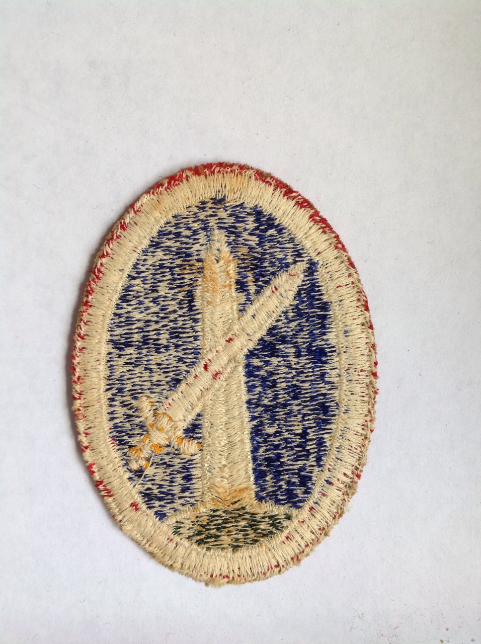On a Blue oval 2 7/8 inches (7.30 cm) in diameter with a 3/16 inch (.48 cm) Red border fimbriated White, issuing from a Green mound in base fimbriated Argent, the Washington Monument of the last superimposed by a Red double handed sword bendwise, fimbriated White, hilt and pommel Gold; all fimbriations 1/32 inch (.08 cm).