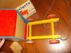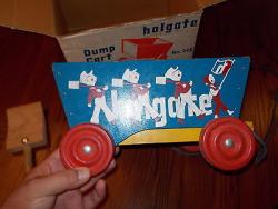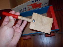A red, white and blue wooden cart with pull cord, which hinges for dumping. Wooden shovel with red-painted handle. Original box is white with red and blue printing, in very good condition.