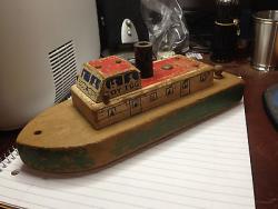 | Description | Well-worn wooden tugboat with type 4b decal (dt4b). Missing front post. See Holgate #253 "Tug Boat" for 1937-1938 design. Page 17, "Holgate Toys" Catalog #17, 1940. Not in later catalogs. |