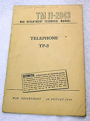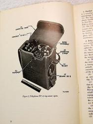 | Description | Restricted. 35 pages. 30 August 1944. Includes destruction notice. Corners bent. Two different names in pencil on cover and title page. "Telephone TP-3 (fig. 1) is a self-contained unit used for two-way signalling and voice communication. It is a sound-powered magneto telephone which requires no batteries or external source of power. It may be used on metallic or grounded circuits composed of field wire, open-wire lines, or cable, and with the following types of circuits and equipment: | Sound-powered telephones. | Local-battery (magneto telephones. | Local-battery (magneto) switchboards. | Two-way ring-down trunk circuits of common battery switchboards. | Common battery line circuits of common battery switchboards. (See subparagraph 6b for limitations on this use.)" See also TM 11-333 "Telephones EE-8, EE-8-A and EE-8-B". |