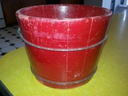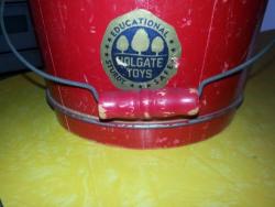 | Description | Red wooden pail/bucket, with wire handle and loops. Large gold Holgate Toys decal (dt4b-large) on side. Originally came with three wooden sand tools. See page 23 of the 1940 catalog, and page 24 of the 1941 catalog. Not found in the 1946 catalog. | |