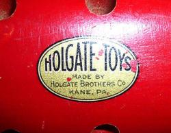 | Description | Very good condition, but missing 18 pegs. Early oval "HOLGATE TOYS | Made by | Holgate Brothers Co | Kane, PA" decal (dt2) on bottom, missing only a few small spots. See Holgate #106 Peg Porcupine (round decal) for one with round decal, and 1934 catalog page 18. |