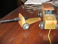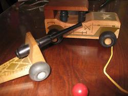 Mint condition jeep with four people, including pull string and ball. Anti-tank gun seems slightly worn.