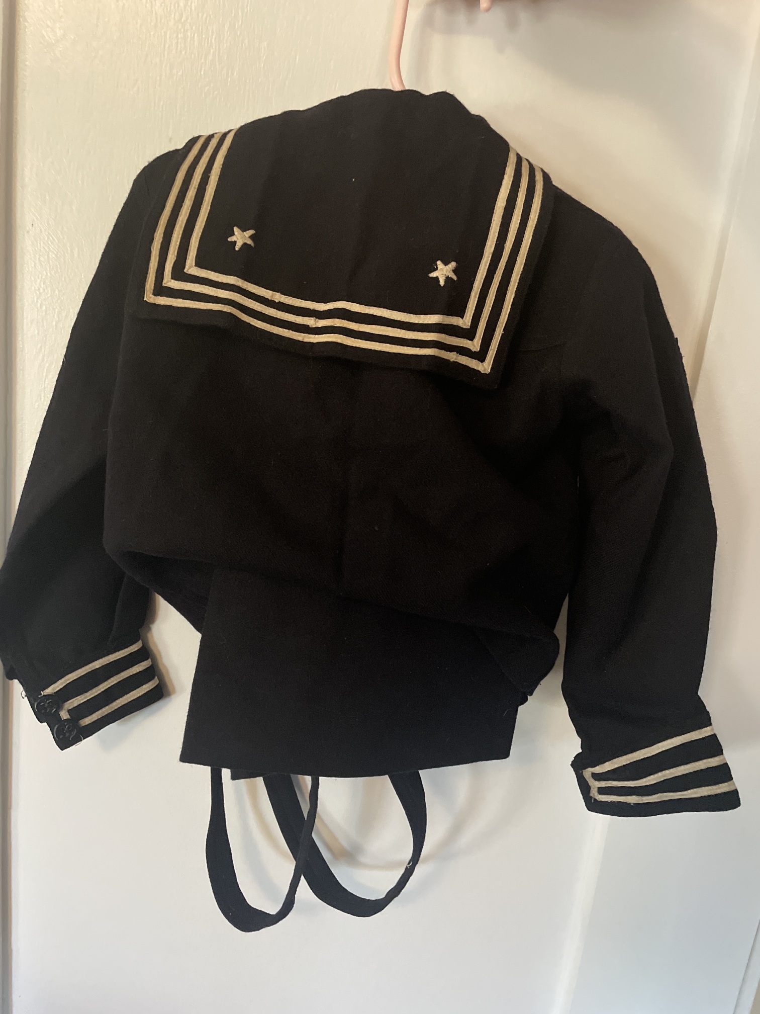 | Description | Blue wool child's sailor's outfit, consisting of blue trousers with integrated suspenders and anchor-button fly (moth damage to front of leg), blue jumper with embroidered wool Boatswain's Mate 2nd Class (sewn stripes) on right sleeve, and a blue "Donald Duck" flat cap with "US NAVY" tally. Came with Child's blue cotton sailor's outfit, Child's white cotton sailor's outfit, USMC doll. |