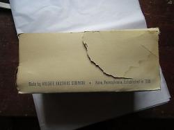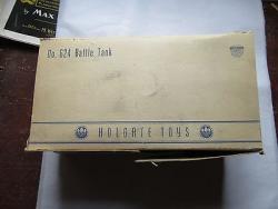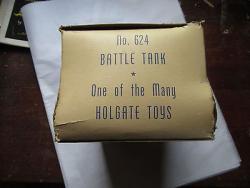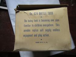 | Description | Mint condition wooden tank, in original cardboard box (with tears). Hand-written card price tag of 3.50 on string tied to pull-string. With small folded catalog. Mint Type 4c decal (perfect dt4c). Crewmen still wrapped together in tissue inside. |