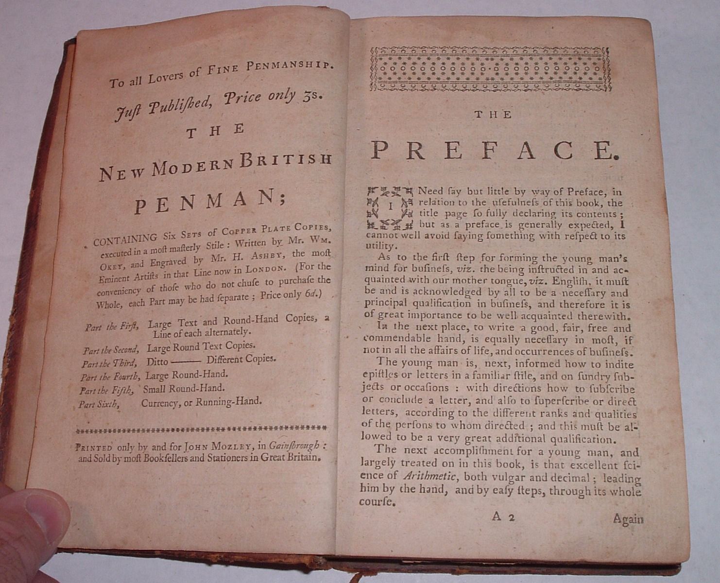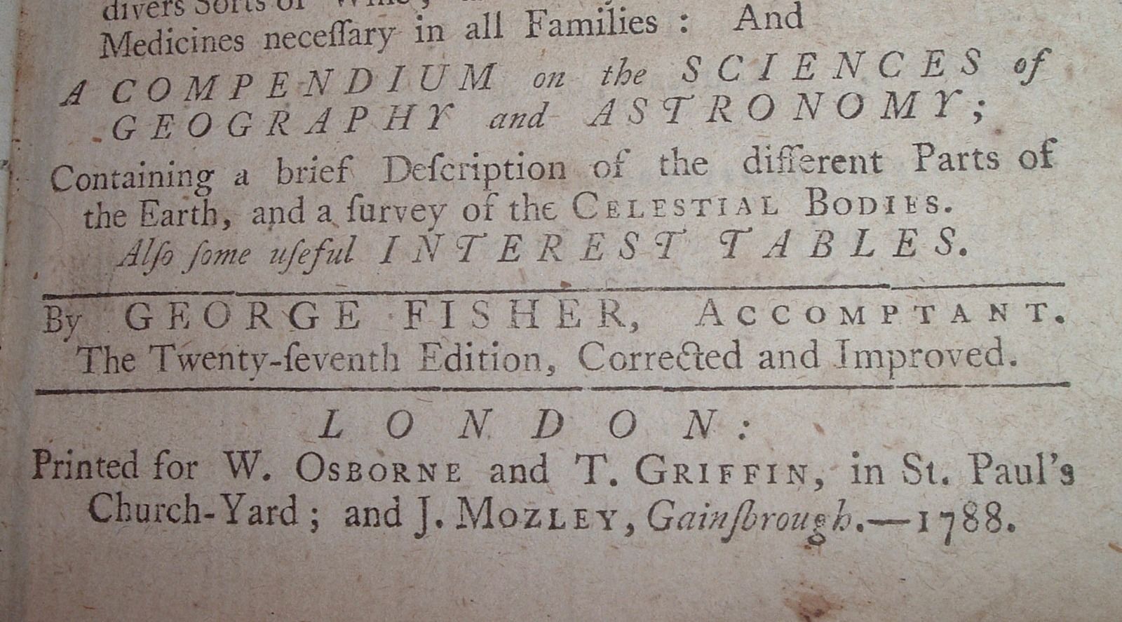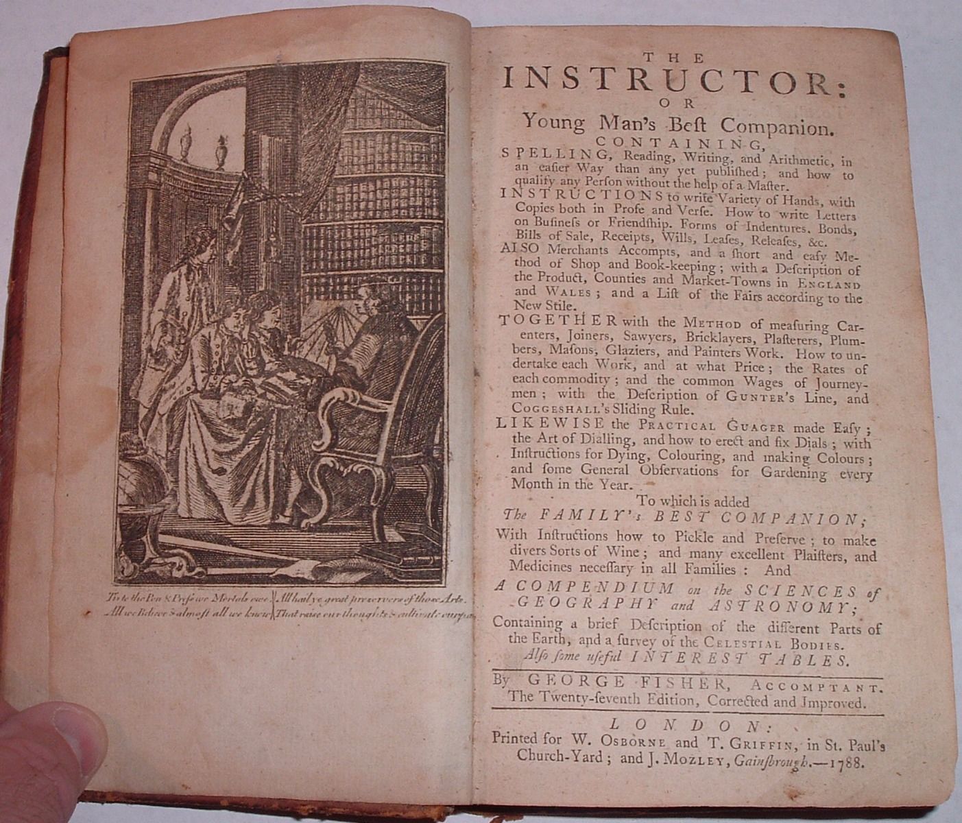 | Description | Covers writing (several written alphabets given), letters, business skills, sundials, astronomy, pickling. "By George Fisher, Accomptant. | The Twenty-seventh Edition, Corrected and Improved." London. Period calf. Front board partially detached. Label illegible. See also "The Young Man's Best Companion". |