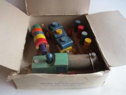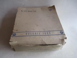 Boiler of locomotive appears faded, otherwise the train is in very good condition, with hardly any wear on anything but the locomotive. Includes a single WWII-era helmeted blue "soldier" as the engineer. Box is un-reinforced, and in poor to good condition. "Made by HOLGATE BROTHERS COMPANY | Kane, Pennsylvania, Established in 1789" on both ends. Price of 3.95 on top of box. |