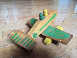 Small wooden plane with green painted details, including 4-leaf clover. "HT676" on right wing. Yellow and green people. Tattered pull-string, with no ball. Found in only the 1946 catalog.