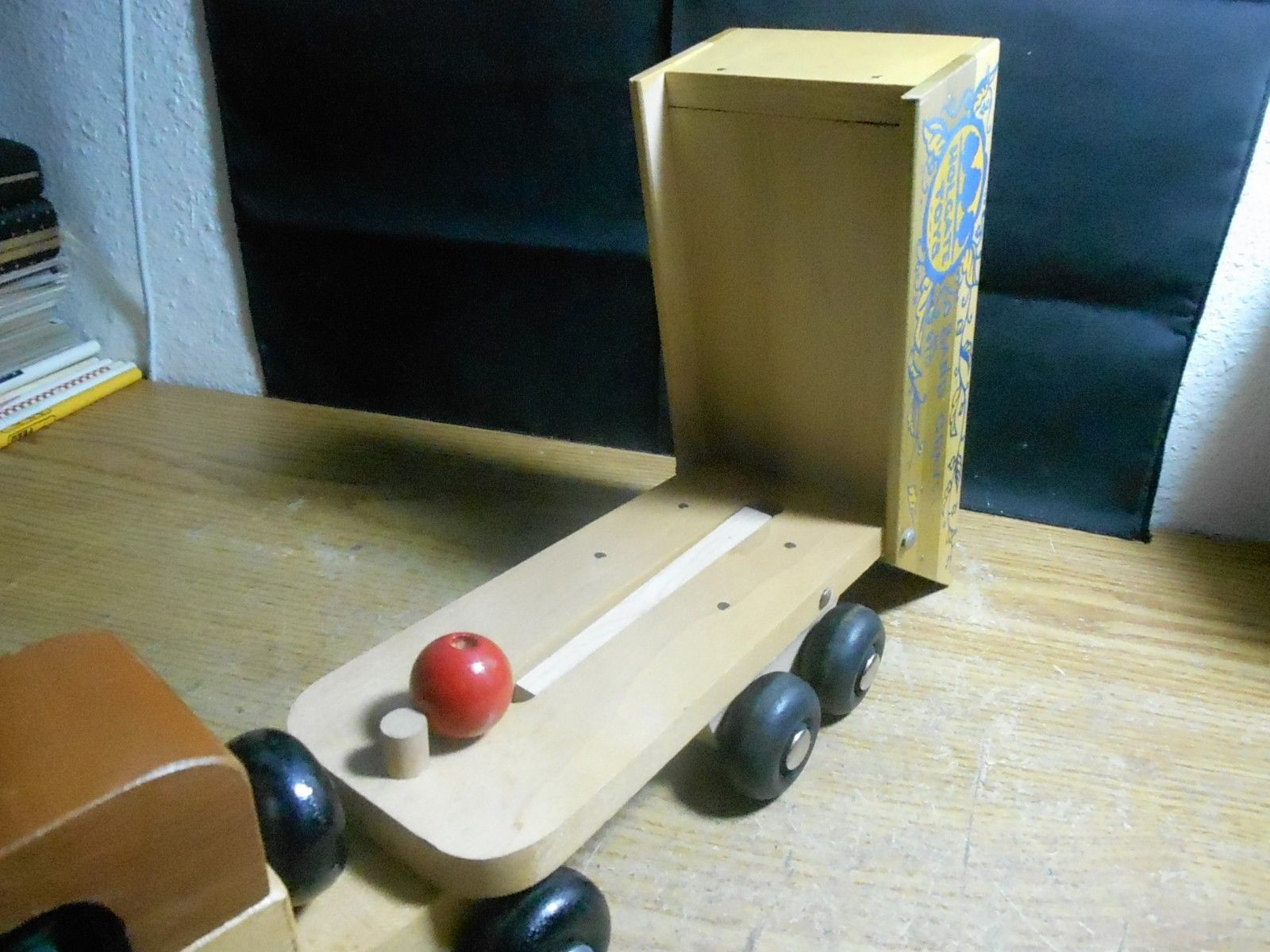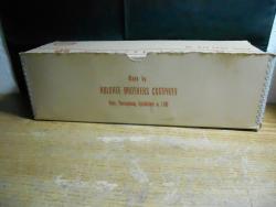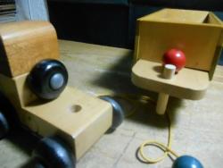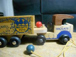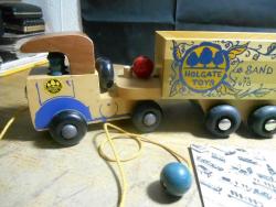| Description | Blue-painted maple, with metal axles. Unused/mint condition. Two men are blue/green painted soldiers with helmets, from the war years. Type 4c decal (dt4c) on left side of cab. See Holgate #678 Holgate Dump Truck for another example. Cream-colored cardboard box has red printing and white metal reinforced edges. One end says, "No. 678 DUMP TRUCK | * | A strong action toy. A tractor | with Dumping Trailer for | dramatic play | * | Age group 4 to 10 years | MADE IN U.S.A.". Also contains green/black printed pamphlet (undated). |