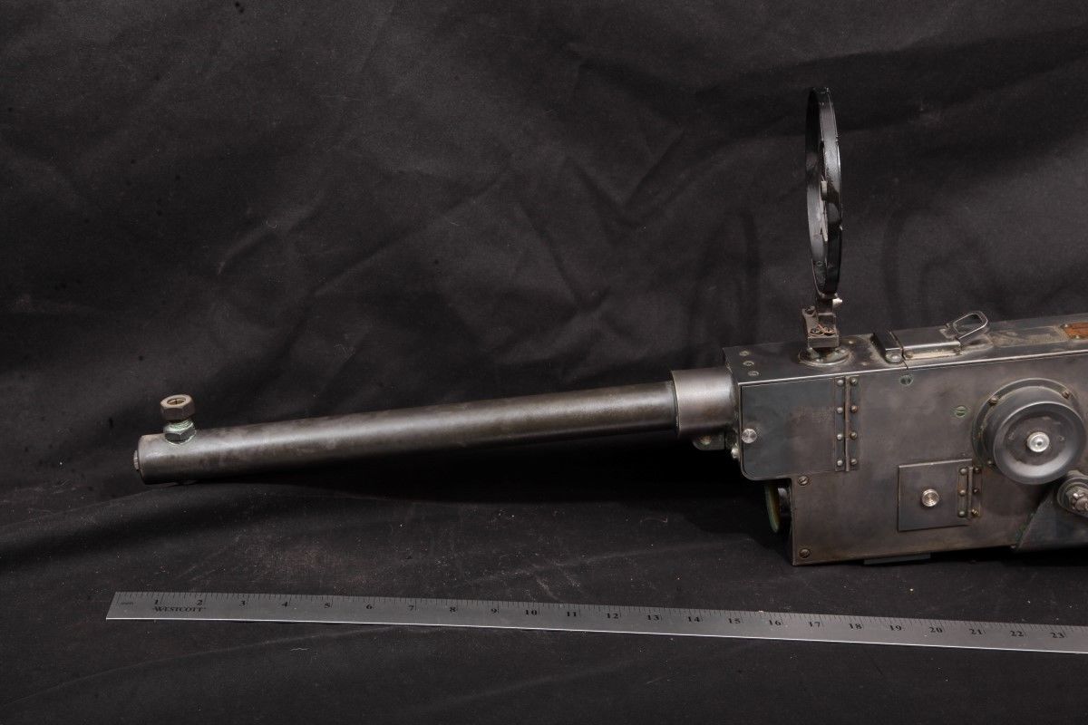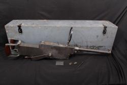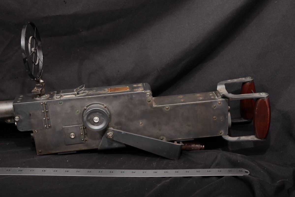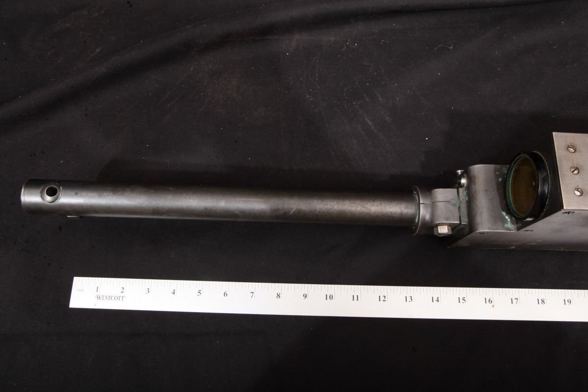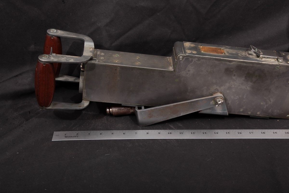 | Description | Camera made by by Fairchild Aviation Corporation for the US Navy Bureau of Ordnance. It was used for training aerial gunners. Serial number 1531. Inspected by "W.W.J.[anchor]". In grey-painted transit case. Complete with watch (Hamilton Bomb Timer), trunion (?), front and rear sights, two padlocks, and an unknown plate with 4 screws. Some corrosion. Frame counter glass may have a crack, and counter does not move freely. Total weight around 70lbs. See USN Gun Camera, Mark VI, Model 3. |