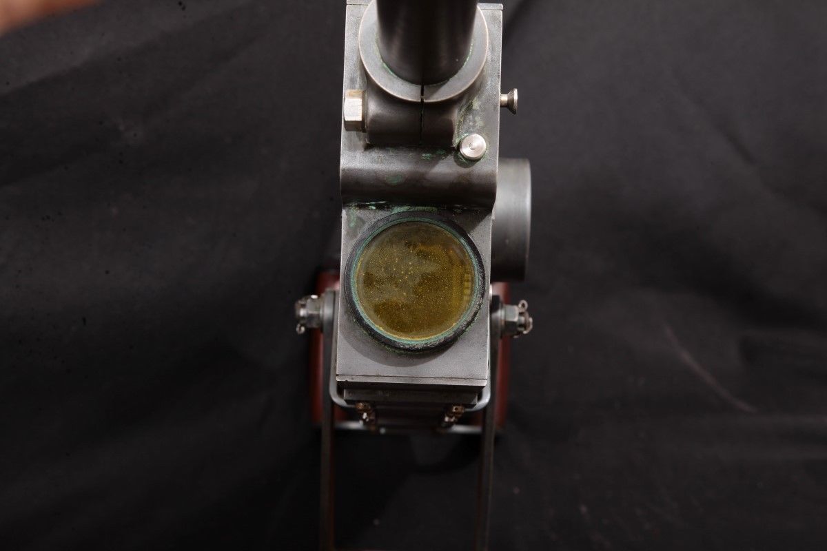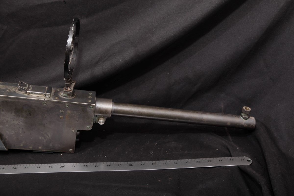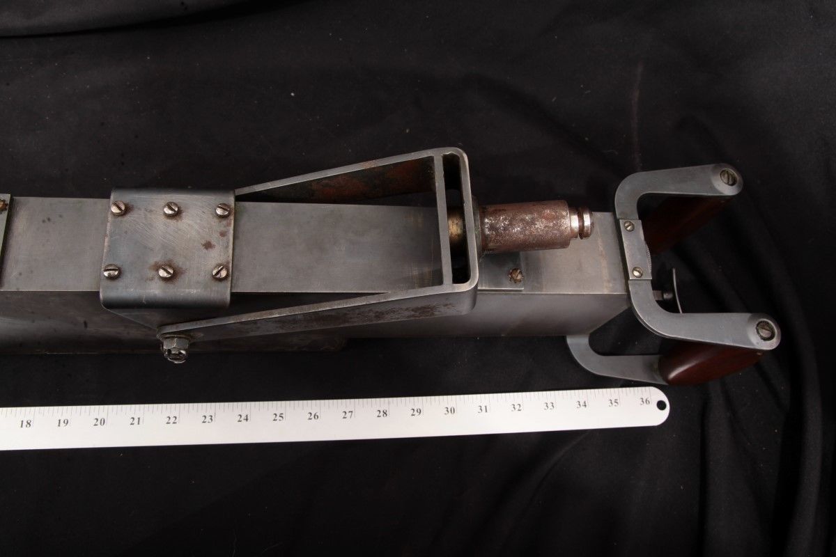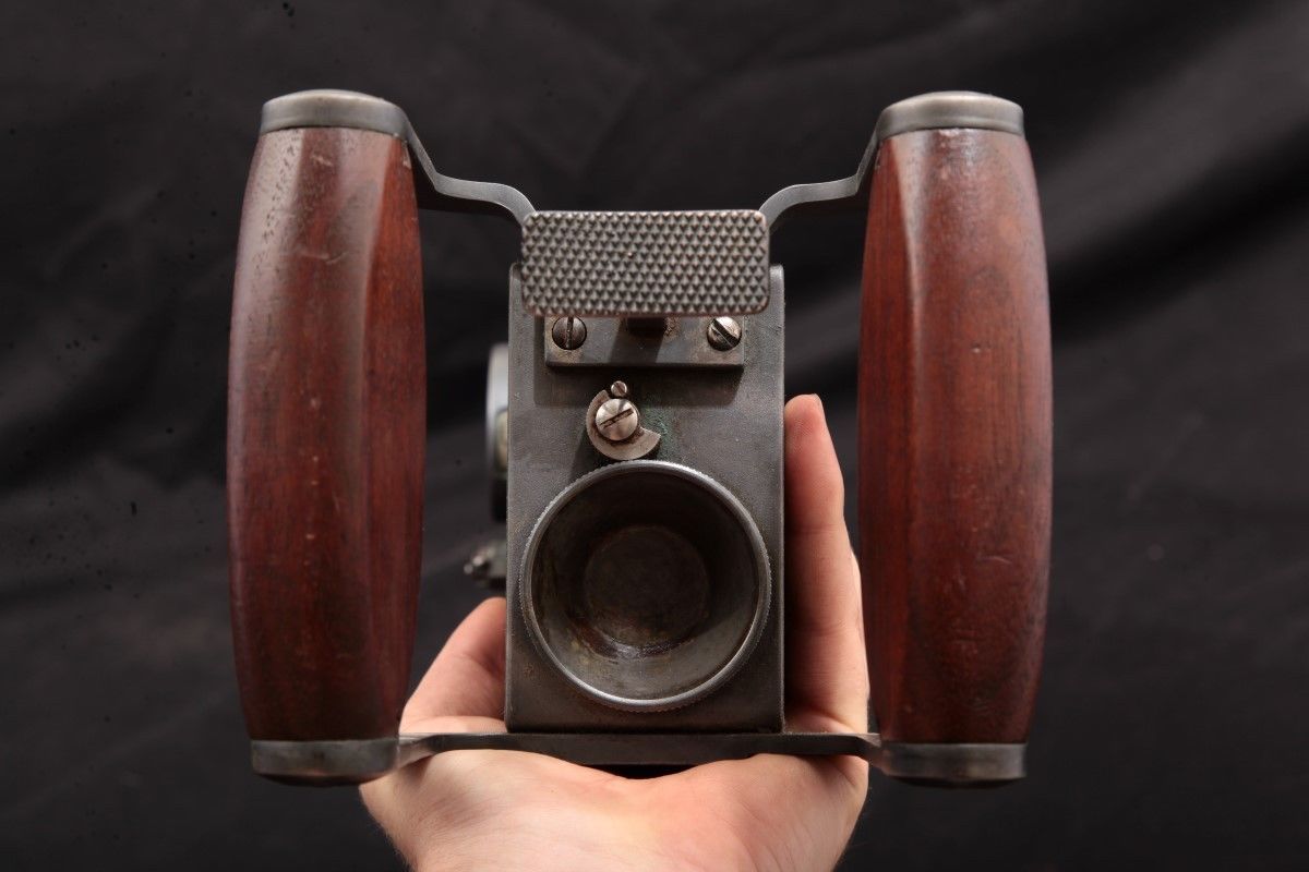 | Description | Camera made by by Fairchild Aviation Corporation for the US Navy Bureau of Ordnance. It was used for training aerial gunners. Serial number 1531. Inspected by "W.W.J.[anchor]". In grey-painted transit case. Complete with watch (Hamilton Bomb Timer), trunion (?), front and rear sights, two padlocks, and an unknown plate with 4 screws. Some corrosion. Frame counter glass may have a crack, and counter does not move freely. Total weight around 70lbs. See USN Gun Camera, Mark VI, Model 3. |