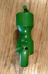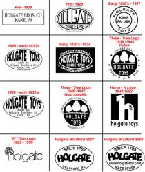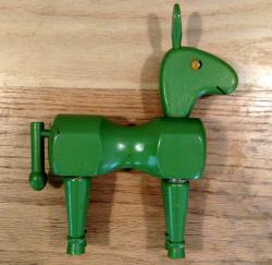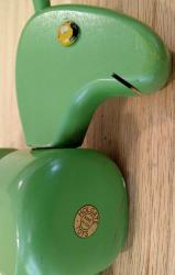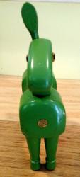 | Description | As seen in the 1935 catalog, this wooden donkey comes apart with both slotted pegs and threads. The threads are, unusually for Holgate, stamped sheet metal nailed to the holds/pegs. All parts painted green, with some green overspray in the sockets. Missing one ear. Eyes appear to be thumb tacks. Known as "Peggity" in the 1934 catalog, and "Donkey Peg" in 1935. Early decal (dt3) in perfect condition to chest. See later, multi-color version with later decal here: Holgate #719 Donkey Peg. |