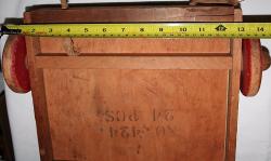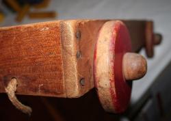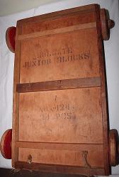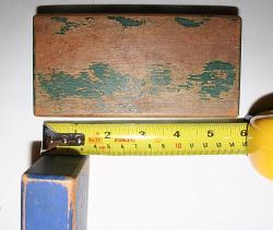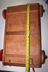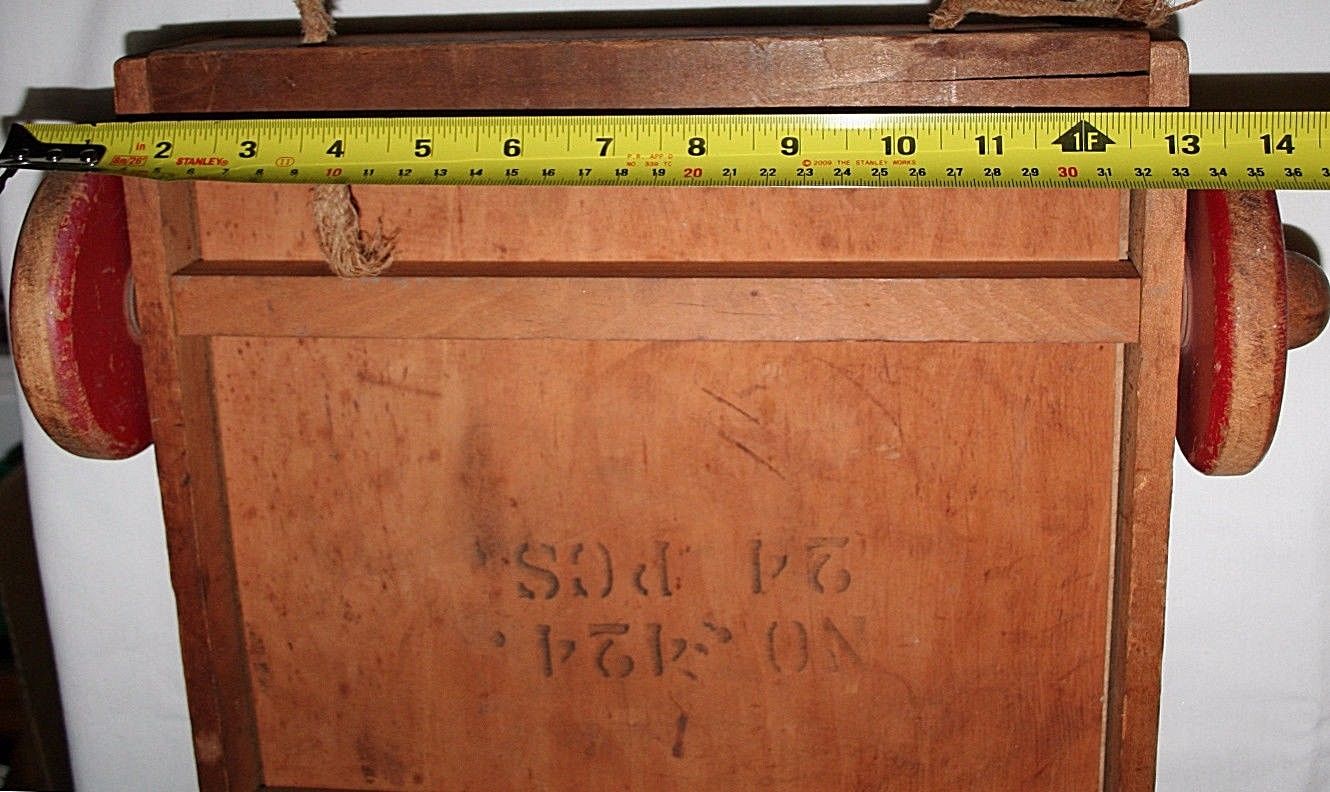 | Description | Early 28-unit Holgate wagon of colored blocks, missing one "column" (cylinder) piece. All other pieces present, though well worn. Wagon has early 1 1/8" diameter wooden hubs, and is unpainted, except for the red wheels. Thick pull rope is broken and frayed. Only markings are stenciled on bottom of wagon: "HOLGATE | JUNIOR BLOCKS", and "NO 424 | 24 PCS". As seen in the 1934 and 1935 catalogs. See Holgate #424 24 Junior Blocks, Colored, in wagon (unmarked) for what is probably a later variation with larger hubs, an additional support on the bottom, and screws instead of nails. |