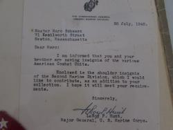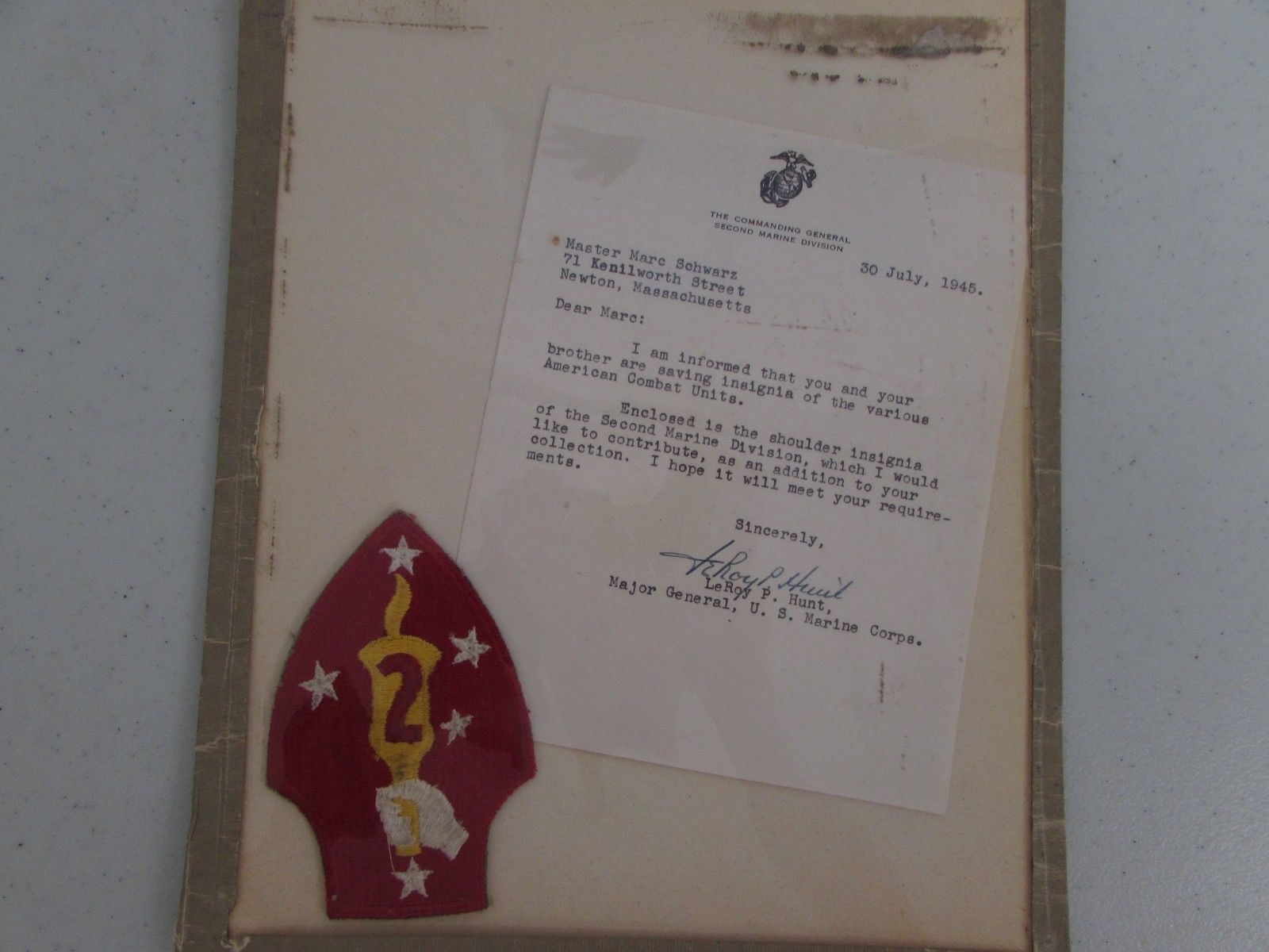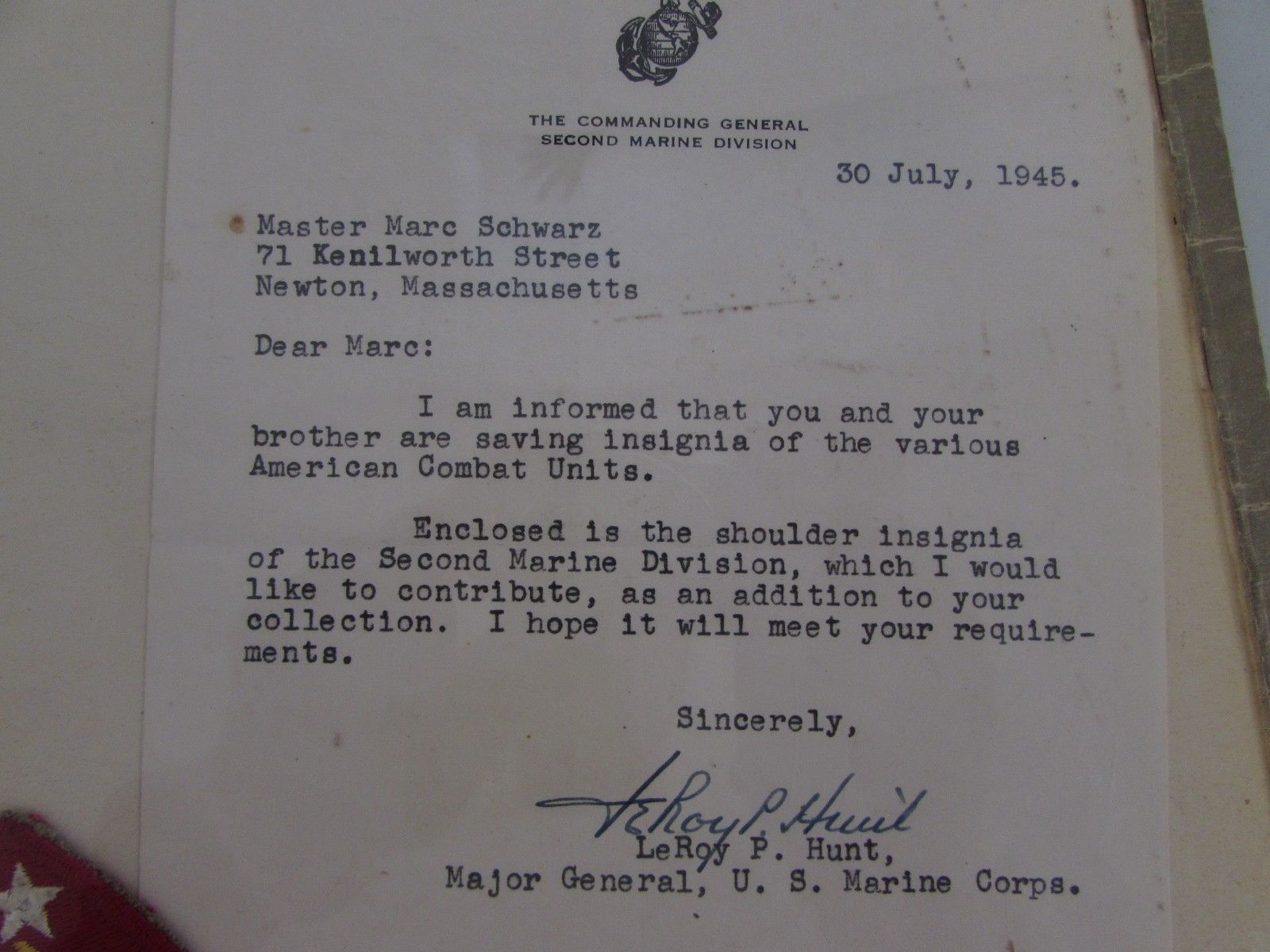 "Master Marc Schwarz | 71 Kenilworth Street | Newton, Massachusetts | | Dear Marc: | | I Am informed that you and your | brother are saving insignia of the various | American Combat Units. | | Enclosed is the shoulder insignia | of the Second Marine Division, which I would | like to contribute, as an addition to your | collection. I hope it will meet your require- | ments. | | Sincerely, | [signed LeRoyP. Hunt] | LeRoy P. Hunt, | Major General, U. S. Marine Corps." |