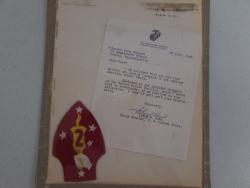 A 2nd Marine Division shoulder patch with a letter, enclosed in clear sleeve.