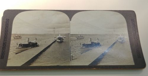 Sterograph of three boats at the Frontenac dock. Electric lights fed by four wires on poles.