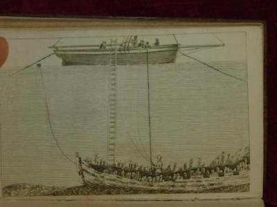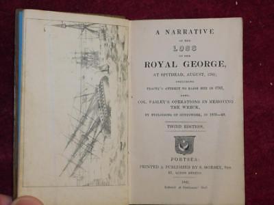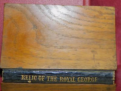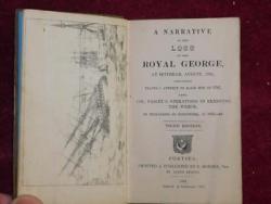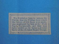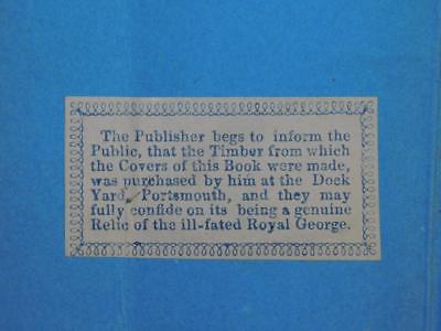 | Description | "A Narrative | of the | Loss | of the | Royal George, | at Spithead, August, 1782; | including | Tracey's Attempt to raise her in 1783, | also, | Col. Pasley's Operations in removing | the wreck, | by explosions of gunpowder, in 1839-40. | ------- | Third Edition. -------- | Portsea: | Printed & Published by S. Horsey, Sen. | 43, Queen Street. | ------- | 1841. | Entered at Stationers' Hall". Oak boards, one crack to front, but intact. Blue end-papers. Gilt edges to pages. Gilt title on spine, "RELIC OF ROYAL GEORGE". Pasted inside front cover: "The Publisher begs to inform the | Public, that the Timber from which | the Covers of this Book were made, | was purchased by him at the Dock | Yard, Portsmouth, and they may | fully confide on its being a genuine | Relic of the ill-fated Royal George." See also: HMS Royal George relic cannon, 5 3/8" HMS Royal George relic cannon, 7 1/2" |