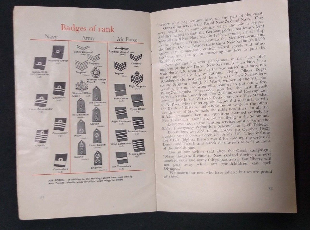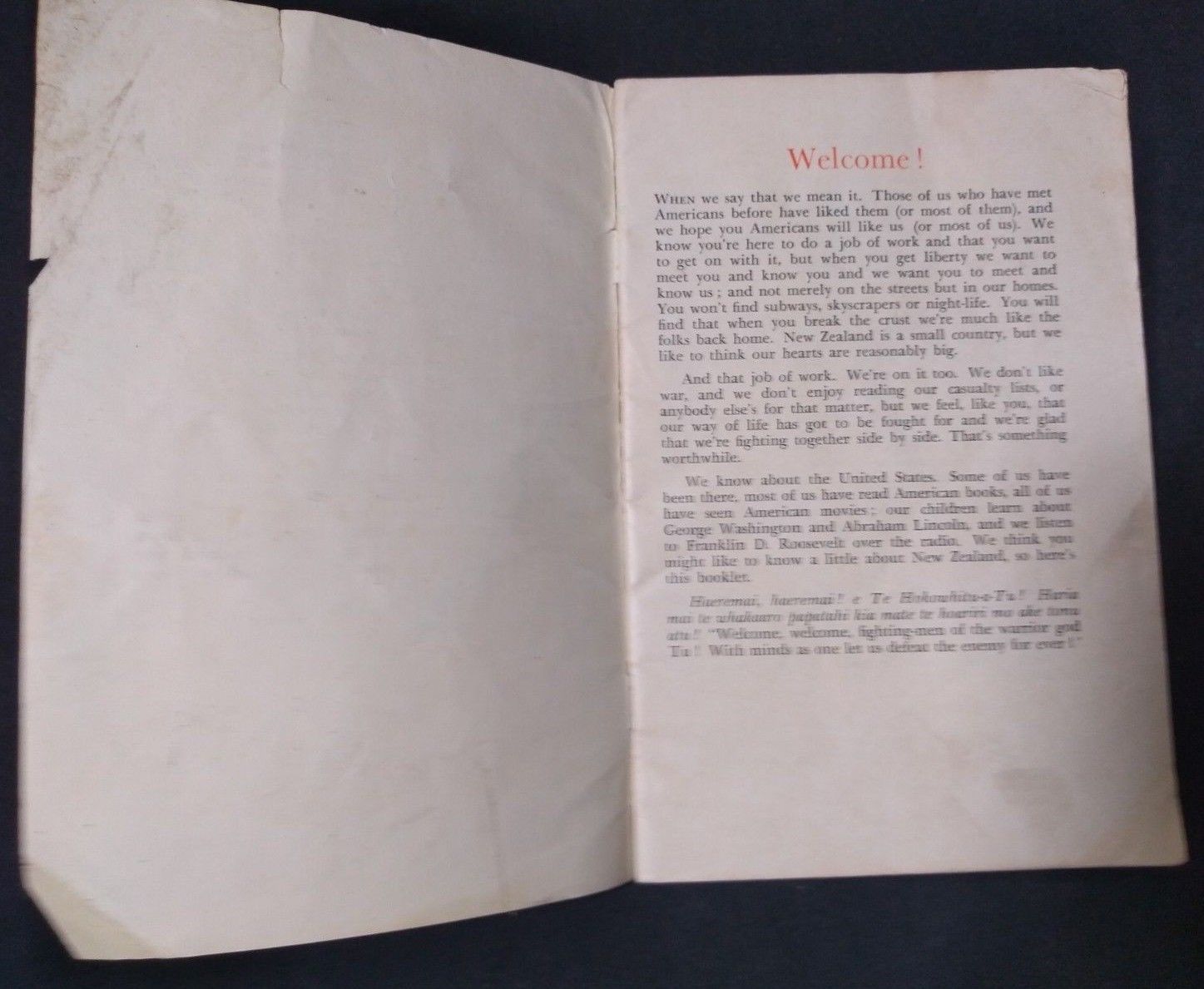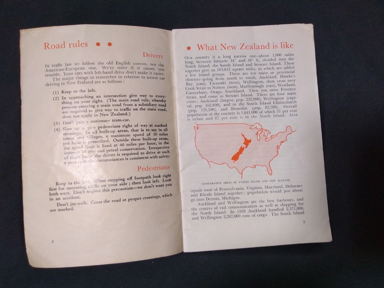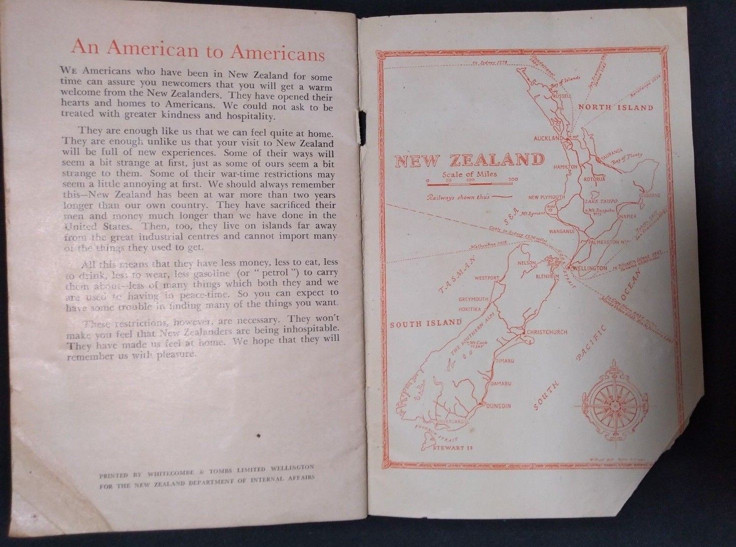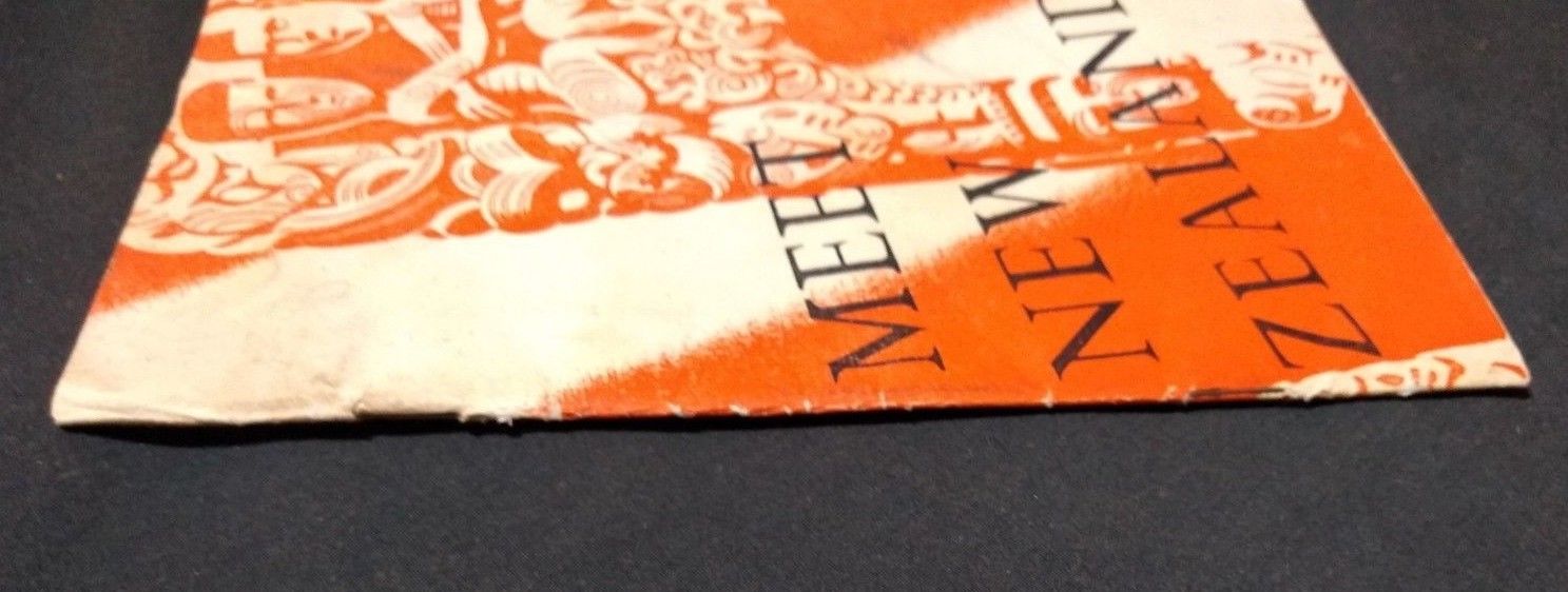 36 page booklet with orange cover, printed for the New Zealand Department of Internal Affairs, to provide US servicemen a primer on living in New Zealand. Corner torn off of rear cover.