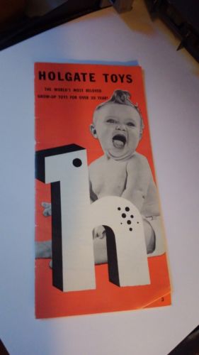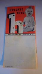 Small pocket-sized catalog, saddle-stitched with two staples. Printed in orange and black. Cover says "HOLGATE TOYS | THE WORLD'S MOST BELOVED | GROW-UP TOYS FOR OVER 30 YEARS". On back, "HOLGATE TOYS, INC. Statesville, N. C.", and "(c) 1957-7--100M". |