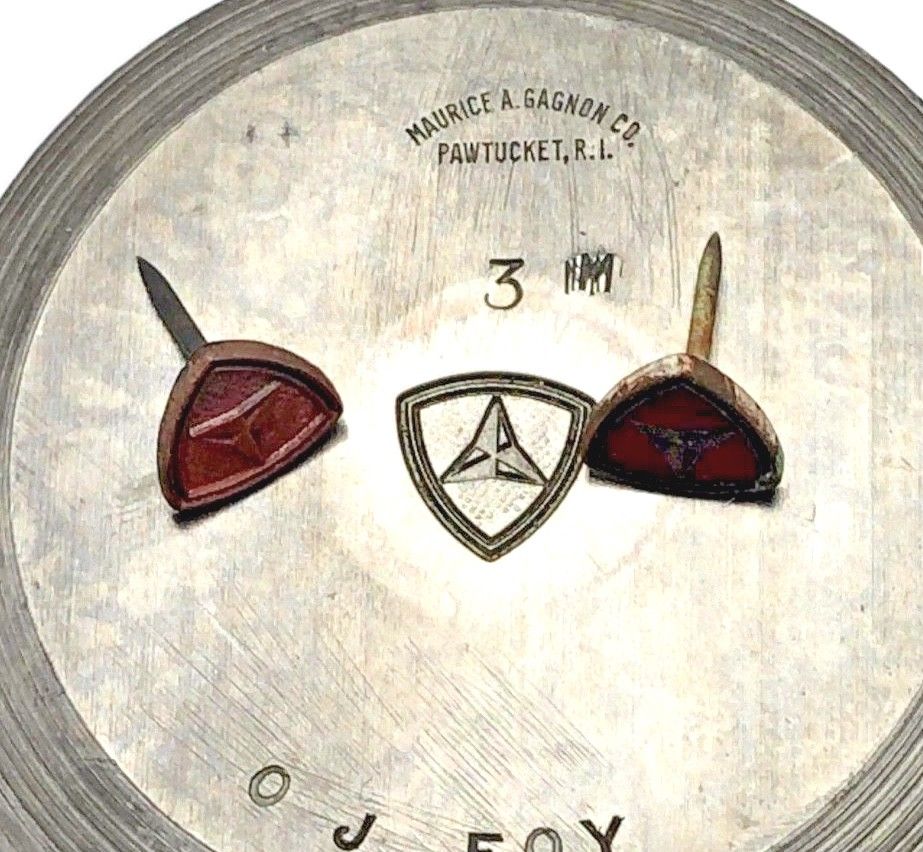 Came with two pin, with pins soldered to back. One is fully enameled (black and red). The other is a reddish color, not sure if this is paint, enamel, or corrosion. |