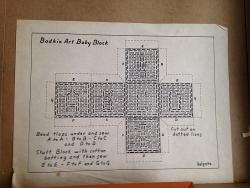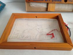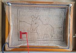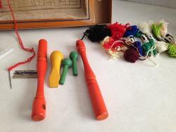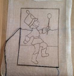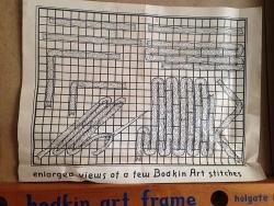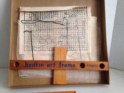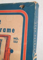 Holgate Toys needlepoint set, consisting of a wooden frame, thick thread (yarn), needle(s?), paper patterns, and patterned cross-stitch cloth. Small hole on top right of box top.