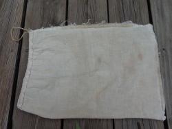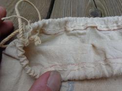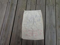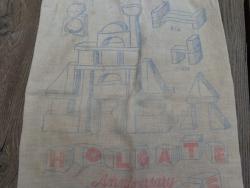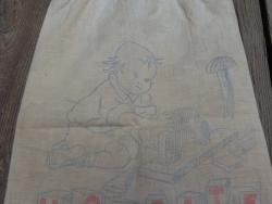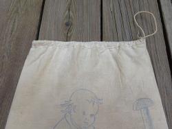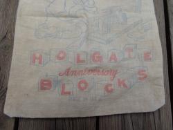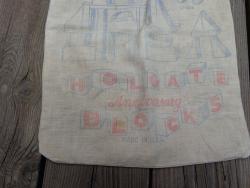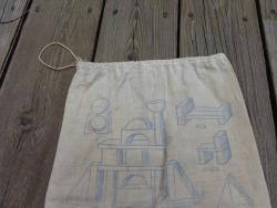 Cloth bag to hold either colored or plain Anniversary Blocks. Printed in blue and red. Shows a boy playing with blocks on one side, and items made with blocks on the other. Draw-string intact.