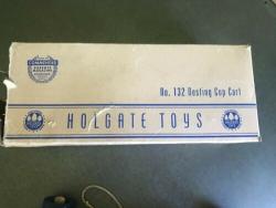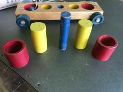 Body of cart unusually appears to be of rough lacquered oak (or beech?). Wooden axles with blue wheels and pull-string ball, similar to late WWII manufacture. Axles are held by small steel nails through the bottom. Drilled pockets are painted the color of the cups that fit in them. The small blue piece in the center is a peg, not hollow. No decal.