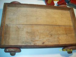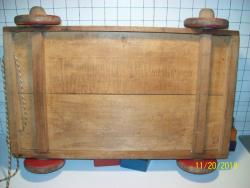 | Description | 28-unit wooden wagon with 21 of the 24 original Junior Blocks. Front of wagon broken in shipping (front split in half, corner split to axle). Slight differences from Holgate #424 24 Junior Blocks, Colored, in wagon (bottom marked): two-piece, unmarked bottom. Wooden hubs are 1 3/4" in diameter, versus 1 1/8". Does not have the middle reinforcement on bottom, only the two crossbars for the axles. Corners held with two "quick" screws (my term, very aggressive TPI), instead of three nails. |