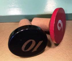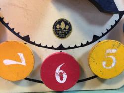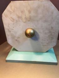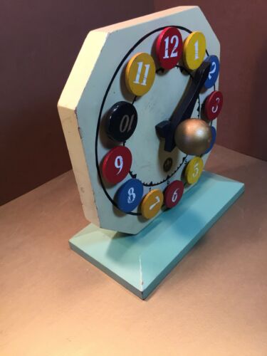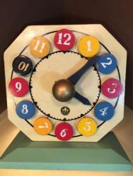 | Description | Octagonal clock on a light green base. Removable colored pegs with arabic numerals, four each of red, yellow, and blue. The blue "10" has been replaced with one made of wood and plastic. Gold balls to front and back unscrew to reposition the two black hands. Rare decal type 4a (dt4a) in mint condition. Not found in catalogs, but appears to be an iteration between the 1935 #733 "Clock Game" and the 1938 #909 "Playroom Clock". Found in an undated brochure, c.1936, "Holgate Toys Created for the Child of Preschool Age". |