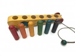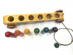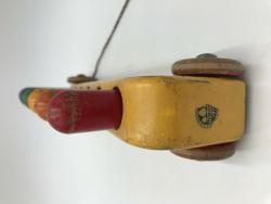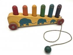 | Description | Early Circus Wagon, with simple elephant theme and thin, contoured red wheels with Thick steel hubs. Yellow, with three interconnected blue elephants on each side. About 60% of the Type 4b (dt4b) decal on the back. Tri-colored pull string with blue ball, a slightly different shade than the blue peg. All six pegs present. Some wear, especially to wheels. This was produced as early as 1936, but I expect it is 1938 based on the decal. |