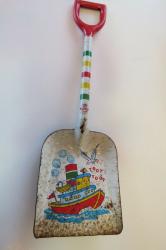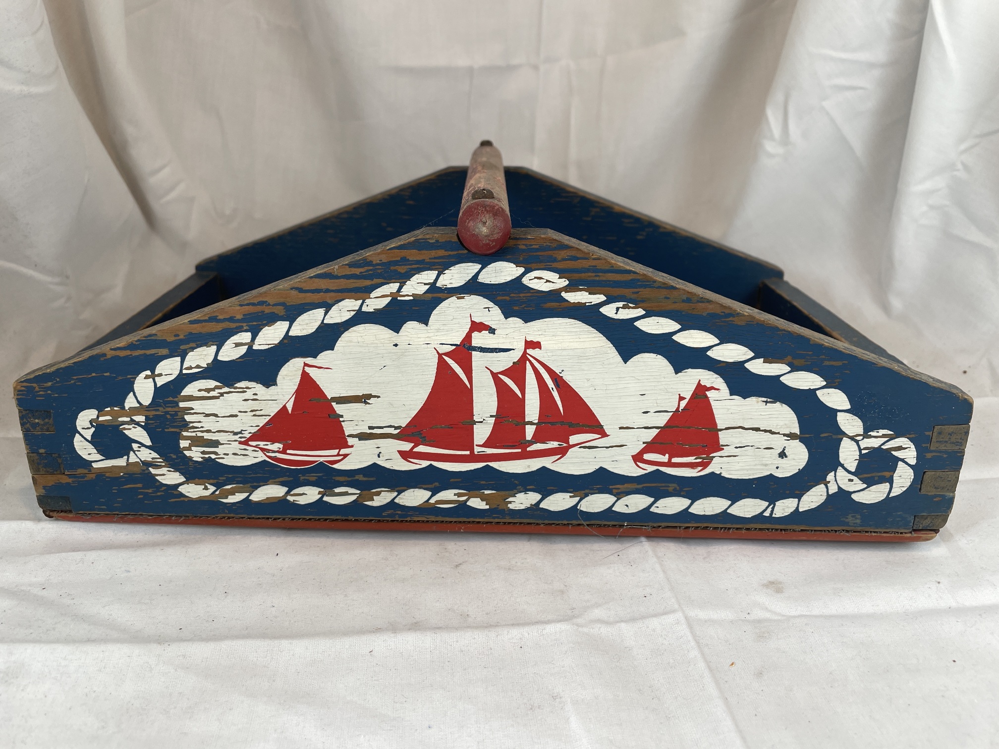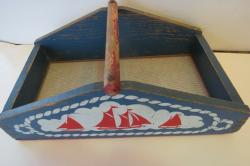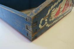 Red, white and blue painted wooden sand-sifter, with simple dovetails. Three red ships surrounded by a white rope on each side. Originally came with wooden tools, as well.