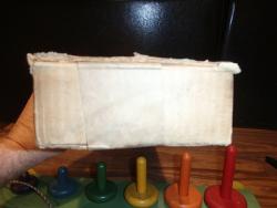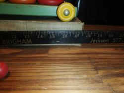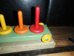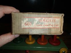 | Description | Holgate #607 pull toy, with six pegs and rings of various sizes and color. Mint Holgate decal type 4a (dt4a) on front. Paint and decal intact, with only slight wear to the wheel edges. Original red-white-blue Z-twist pull string with red ball. Original single piece corrugated cardboard box, with simple red-on-white label at end with large "607" and "HOLGATE | Color Cone Peg Cart". Other text above "607" obscured by insect damage. |