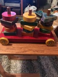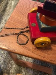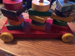 | Description | Slightly earlier version of Holgate #728 "Triform Cart", with dt3 decal and small steel eye for pull string (instead of vertical hole). Tri-color pull string appears complete, but is missing the ball and has several knots. All six circles are present, along with five squares and 4 triangles. I don't believe any of the three pegs are original. |