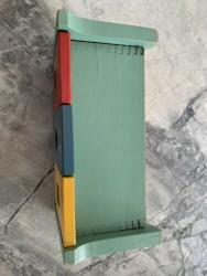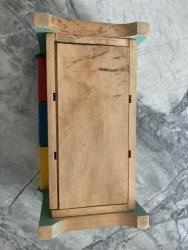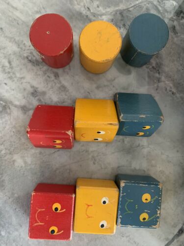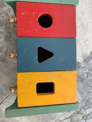 | Description | Play Cabinet in very good condition, but some loosening of the dovetails. Complete type 4b decal (dt4b) on front. Some chipped pain on inside corners. Shape doors are in a different order than on Holgate #905 "Play Cabinet", no blocks and in the catalog. Should probably be red-yellow-blue. All nine shapes present, with painted faces. These pieces are very similar to the shapes from Holgate #726 "Toyland Tower". |