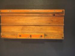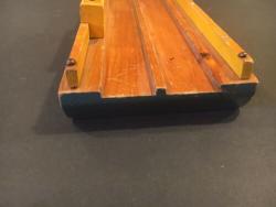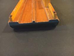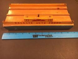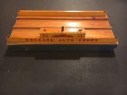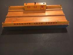 | Description | First model Auto ferry, blue with yellow, red and orange. "HOLGATE AUTO FERRY" on both sides, an an art deco typeface. Deck is varnished or lacquered, and uncharacteristically, has a small knot in the wood. 1937 catalog confirms it to originally have come with three cast Tootsie toy cars. For appropriate replacements, see Tootsietoy #113 blue Ford Wrecker and Tootsietoy #111 green Ford Sedan. |