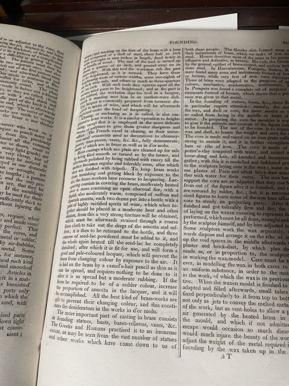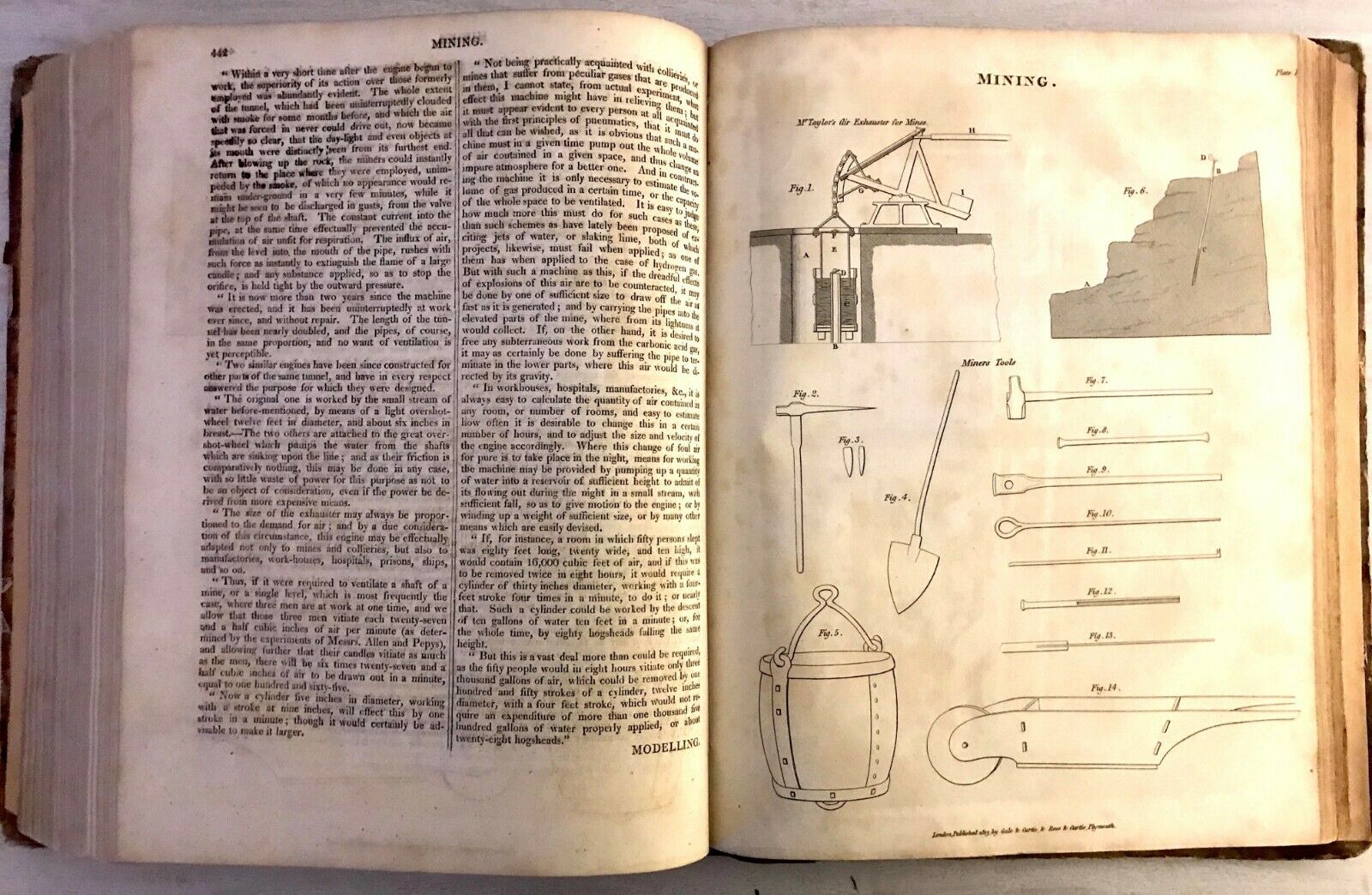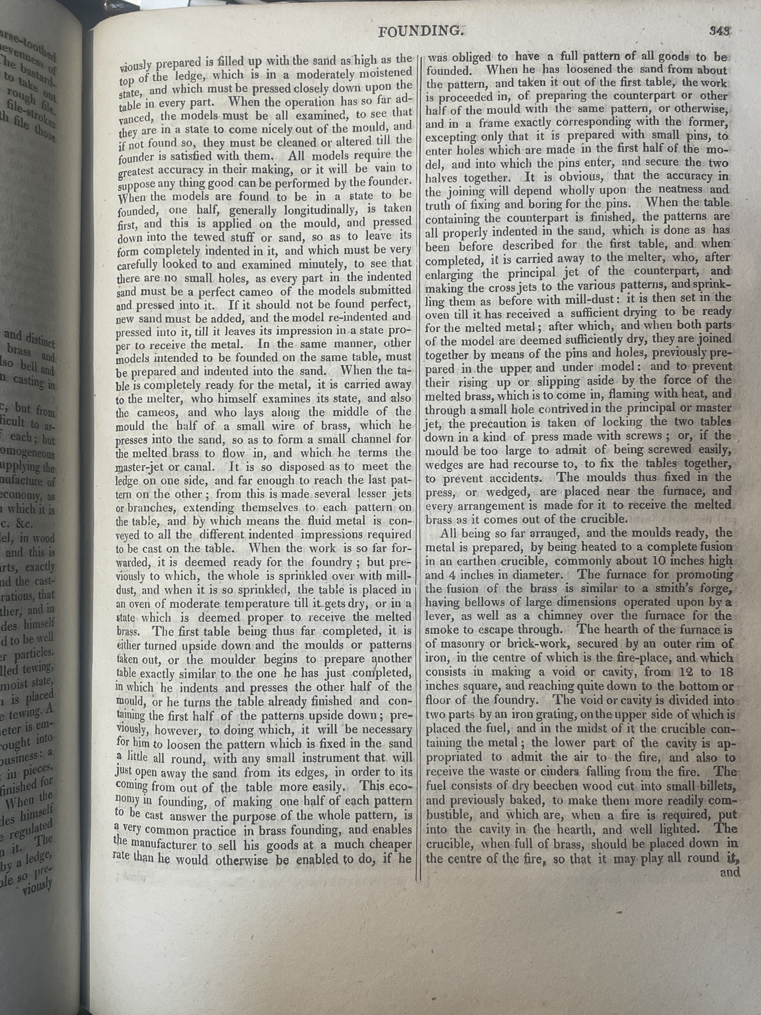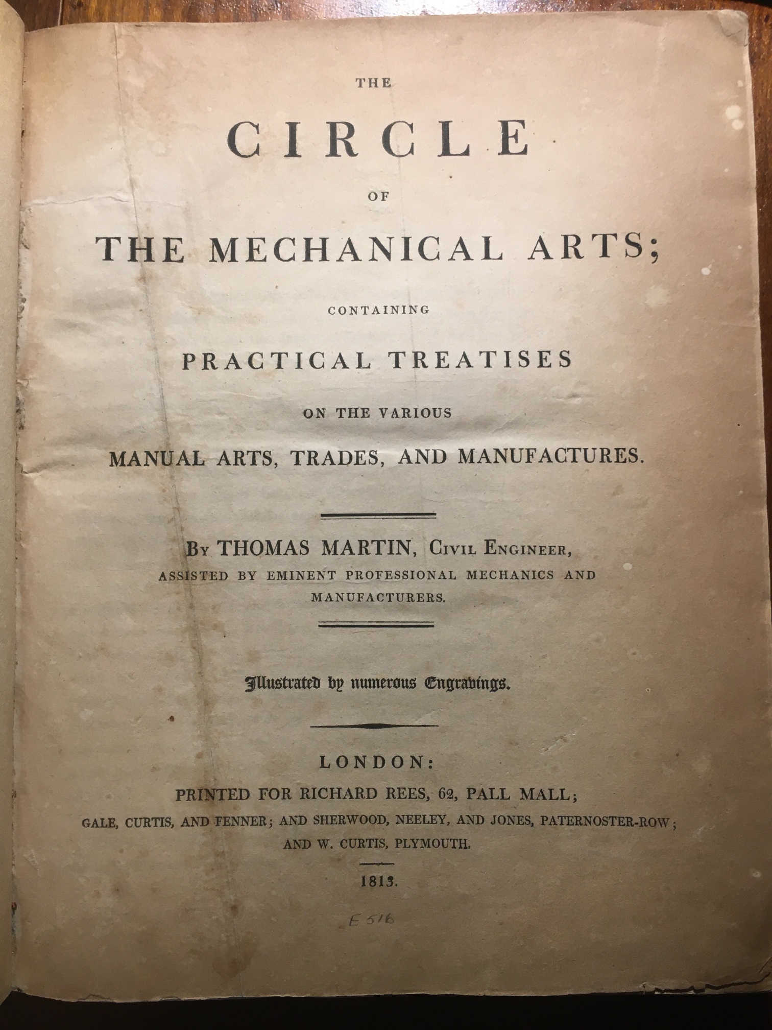 | Description | "The | CIRCLE | of | THE MECHANICAL ARTS; | containing | Practical Treatises | on the various | Manual Arts, Trades, and Manufactures. | ====== | By THOMAS MARTIN, Civil Engineer" ... "LONDON: | PRINTED FOR RICHARD REES, 62, PALL MALL; | Gale, Curtis, and Fenner; and Sherwood, Neeley, and Jones, Paternoster-row; | and W. Curtis, Plymouth. | --- | 1813." Quarter-calf with marbled boards. 616 pages, plus plates. Contents: Architecture Bridges Baking Basket-making Block-making Book-binding Brewing Brick-laying Brick-making Button-making Cabinet-making Carpentry and Joinery Carving and Gilding Coach-making Comb-making Coopering Cotton manufacture Currying Cutlery Dyeing Engineering Enamelling Engraving File-making Founding Glass-making Glazing Gold-beating and gilt wire-drawing Gun-making Hat-making Japanning Masonry Mining Modelling Musical instrument-making Nail-making Needle-making Painting (house) Paper-making Patten-making Pin-making Pipe-making Planing Plastering Plumbery Pottery Printing Rectification Rope-making Sawing Shot-making Slating Soap-making Staining of paper Starch-making Tallow and wax chandlery Tanning Tin-plate-working Turning Watch and clock-making Weaving Wheel-wright Wire-drawing Wool-combing Practical geometry Fire-gilding is covered in detail in the Buttonmaking chapter. "Clock Work" illustrations (of earlier edition?) reprinted in "Horological Shop Tools 1700 to 1900", T.R. Crom, page 215. Topic: brslac photos: 9; Founding: 10-?; Typefounding later in Founding chapter (not shown). |