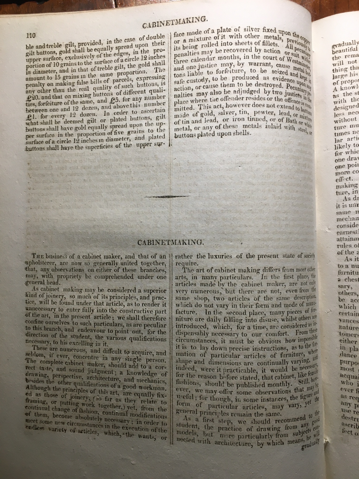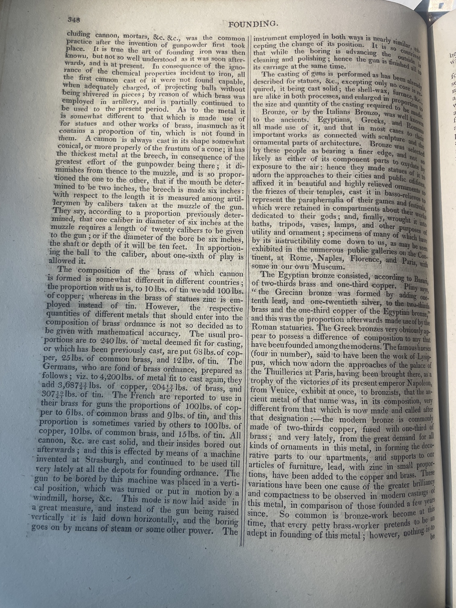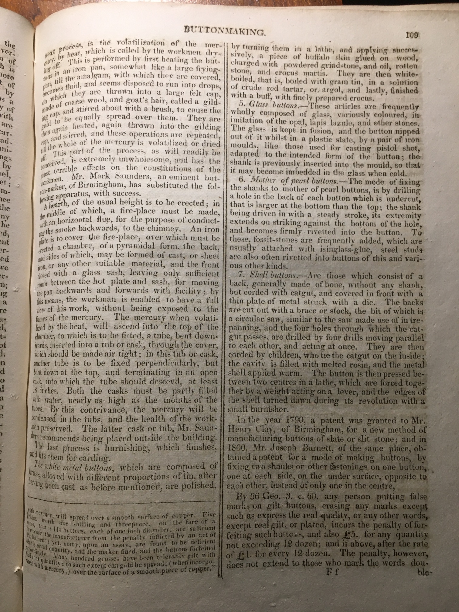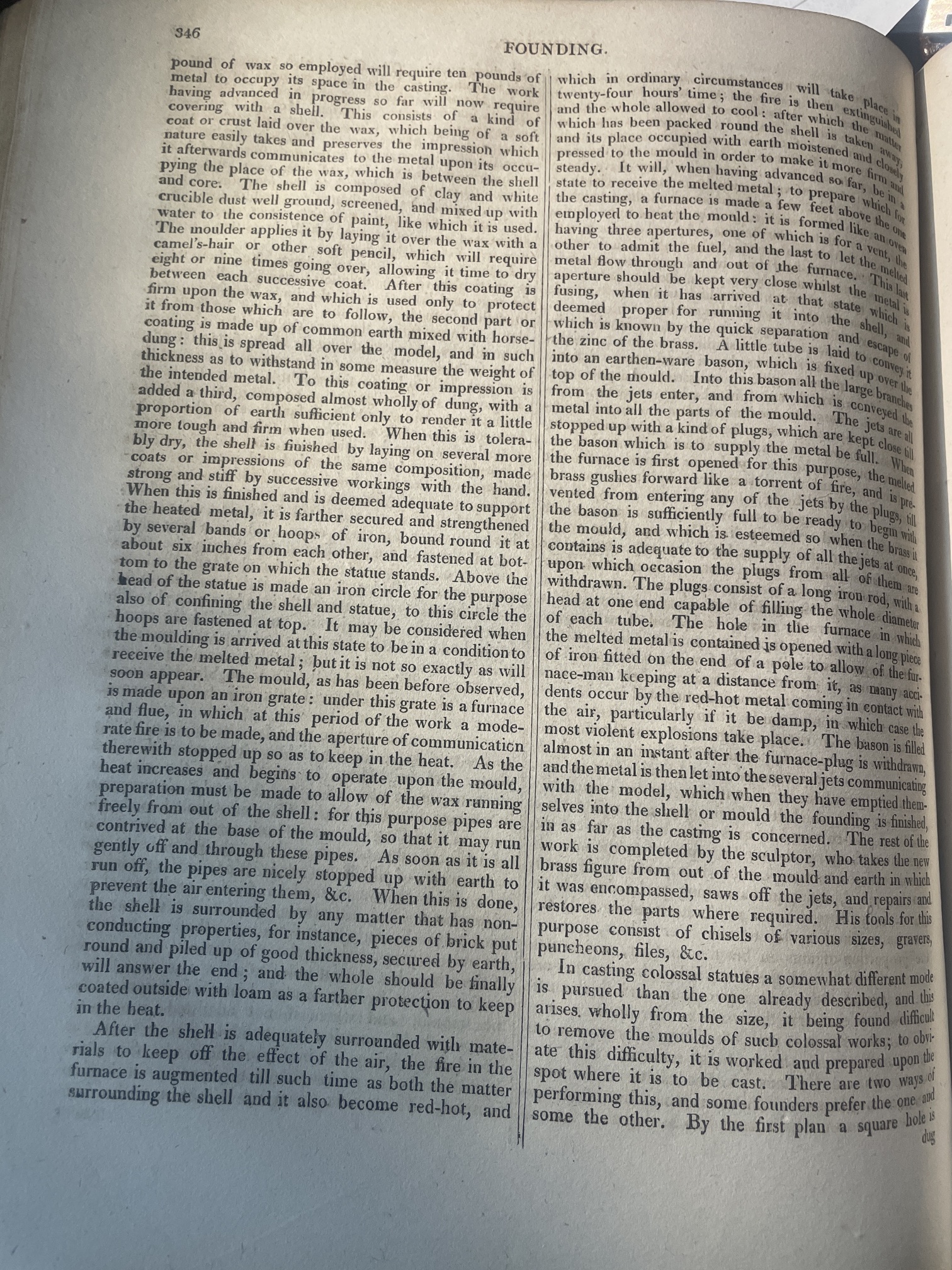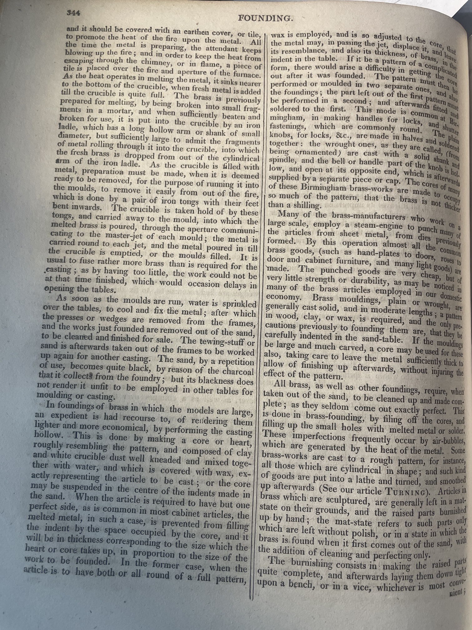 | Description | "The | CIRCLE | of | THE MECHANICAL ARTS; | containing | Practical Treatises | on the various | Manual Arts, Trades, and Manufactures. | ====== | By THOMAS MARTIN, Civil Engineer" ... "LONDON: | PRINTED FOR RICHARD REES, 62, PALL MALL; | Gale, Curtis, and Fenner; and Sherwood, Neeley, and Jones, Paternoster-row; | and W. Curtis, Plymouth. | --- | 1813." Quarter-calf with marbled boards. 616 pages, plus plates. Contents: Architecture Bridges Baking Basket-making Block-making Book-binding Brewing Brick-laying Brick-making Button-making Cabinet-making Carpentry and Joinery Carving and Gilding Coach-making Comb-making Coopering Cotton manufacture Currying Cutlery Dyeing Engineering Enamelling Engraving File-making Founding Glass-making Glazing Gold-beating and gilt wire-drawing Gun-making Hat-making Japanning Masonry Mining Modelling Musical instrument-making Nail-making Needle-making Painting (house) Paper-making Patten-making Pin-making Pipe-making Planing Plastering Plumbery Pottery Printing Rectification Rope-making Sawing Shot-making Slating Soap-making Staining of paper Starch-making Tallow and wax chandlery Tanning Tin-plate-working Turning Watch and clock-making Weaving Wheel-wright Wire-drawing Wool-combing Practical geometry Fire-gilding is covered in detail in the Buttonmaking chapter. "Clock Work" illustrations (of earlier edition?) reprinted in "Horological Shop Tools 1700 to 1900", T.R. Crom, page 215. Topic: brslac photos: 9; Founding: 10-?; Typefounding later in Founding chapter (not shown). |