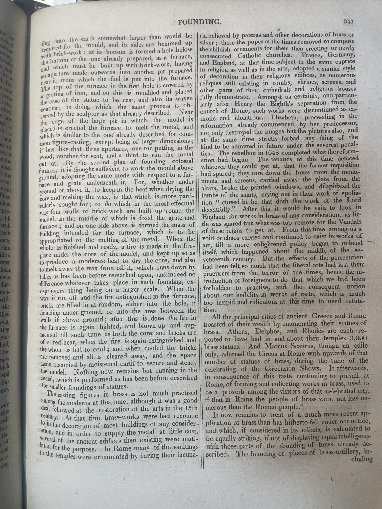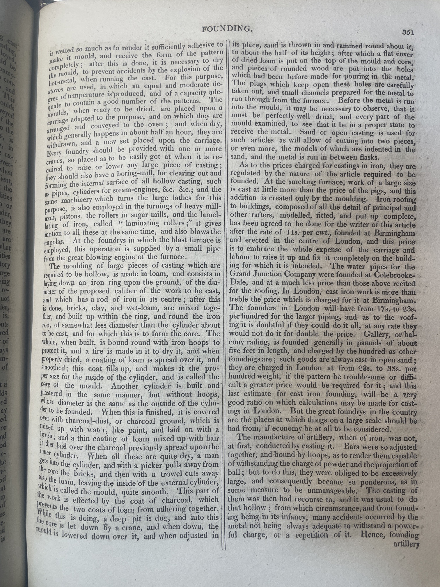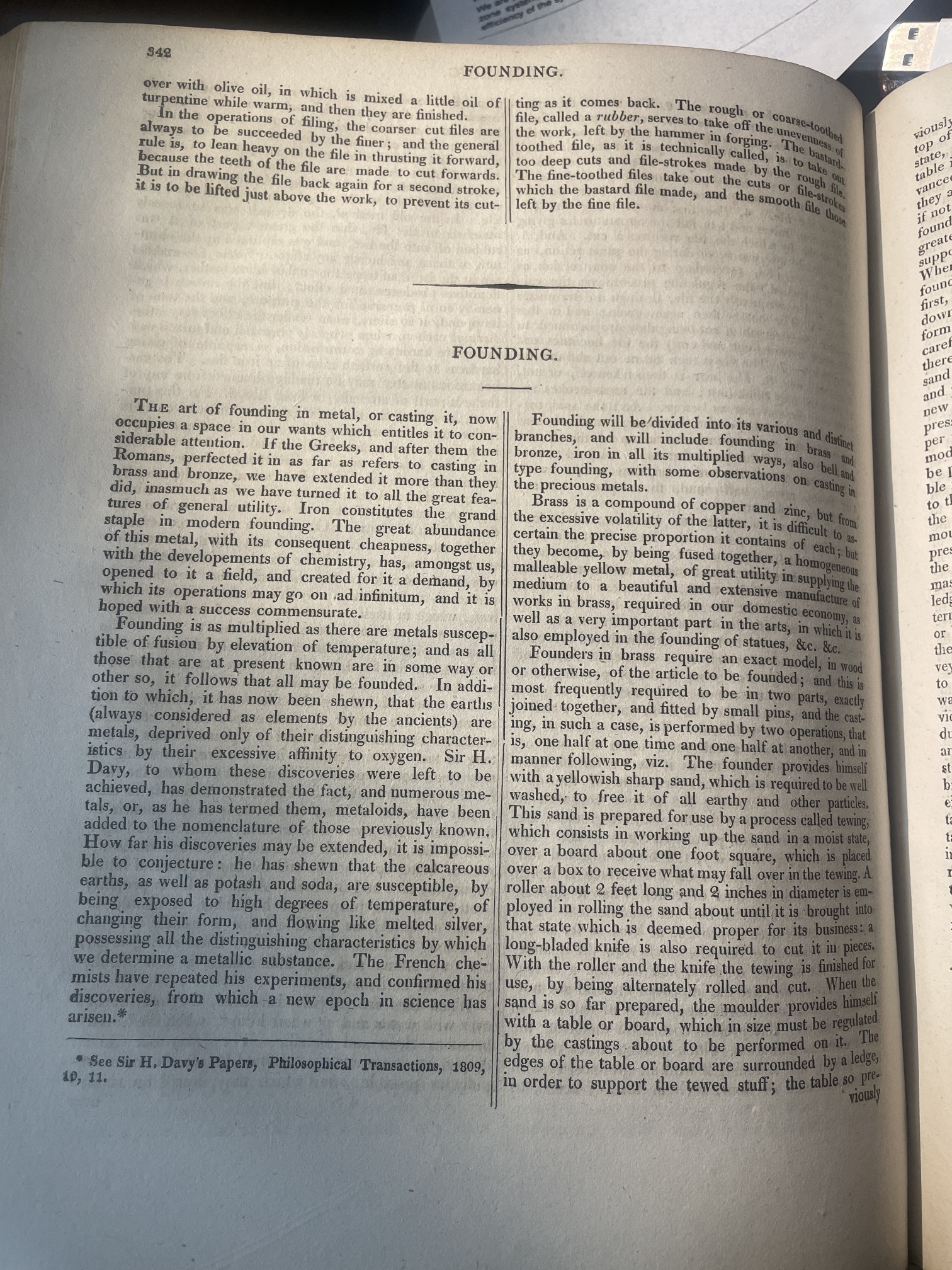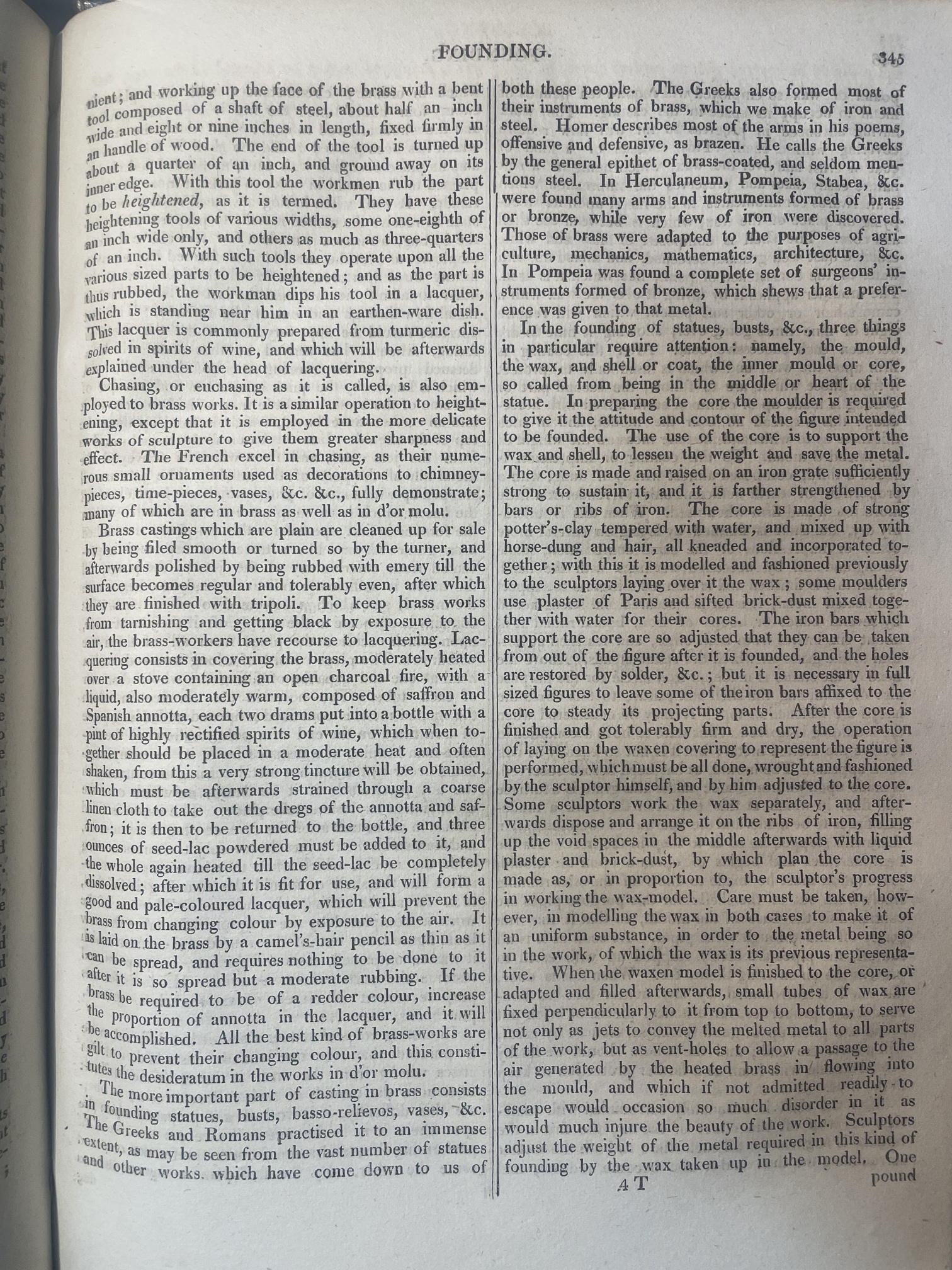 | Description | "The | CIRCLE | of | THE MECHANICAL ARTS; | containing | Practical Treatises | on the various | Manual Arts, Trades, and Manufactures. | ====== | By THOMAS MARTIN, Civil Engineer" ... "LONDON: | PRINTED FOR RICHARD REES, 62, PALL MALL; | Gale, Curtis, and Fenner; and Sherwood, Neeley, and Jones, Paternoster-row; | and W. Curtis, Plymouth. | --- | 1813." Quarter-calf with marbled boards. 616 pages, plus plates. Contents: Architecture Bridges Baking Basket-making Block-making Book-binding Brewing Brick-laying Brick-making Button-making Cabinet-making Carpentry and Joinery Carving and Gilding Coach-making Comb-making Coopering Cotton manufacture Currying Cutlery Dyeing Engineering Enamelling Engraving File-making Founding Glass-making Glazing Gold-beating and gilt wire-drawing Gun-making Hat-making Japanning Masonry Mining Modelling Musical instrument-making Nail-making Needle-making Painting (house) Paper-making Patten-making Pin-making Pipe-making Planing Plastering Plumbery Pottery Printing Rectification Rope-making Sawing Shot-making Slating Soap-making Staining of paper Starch-making Tallow and wax chandlery Tanning Tin-plate-working Turning Watch and clock-making Weaving Wheel-wright Wire-drawing Wool-combing Practical geometry Fire-gilding is covered in detail in the Buttonmaking chapter. "Clock Work" illustrations (of earlier edition?) reprinted in "Horological Shop Tools 1700 to 1900", T.R. Crom, page 215. Topic: brslac photos: 9; Founding: 10-?; Typefounding later in Founding chapter (not shown). |