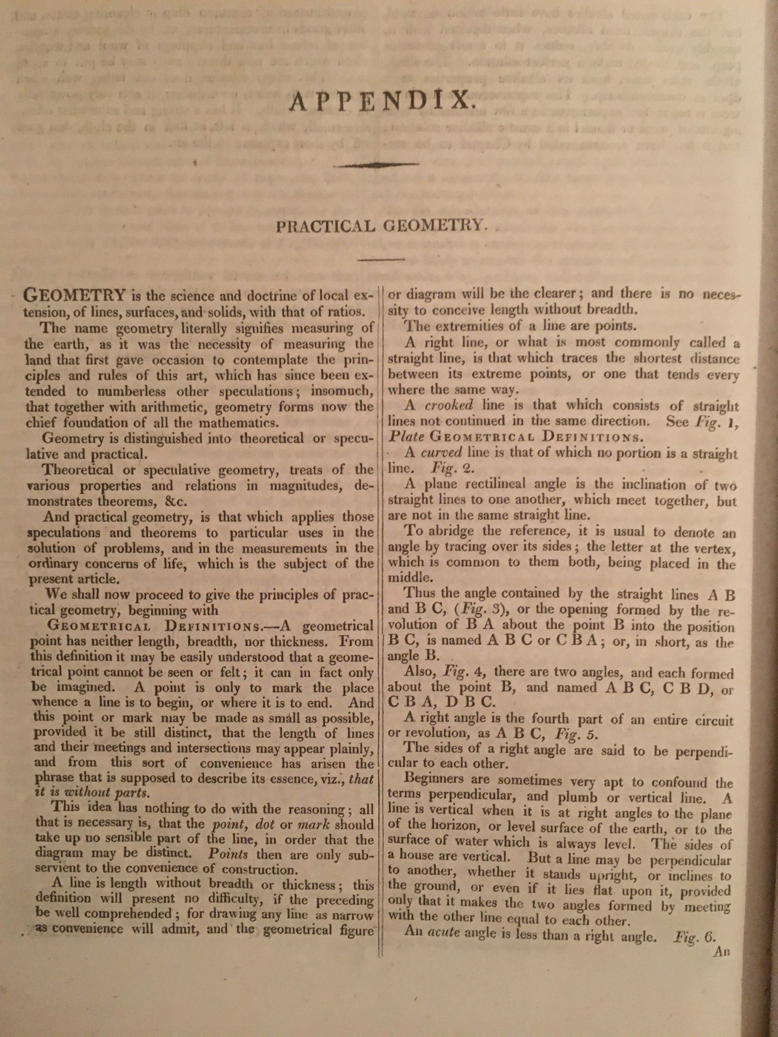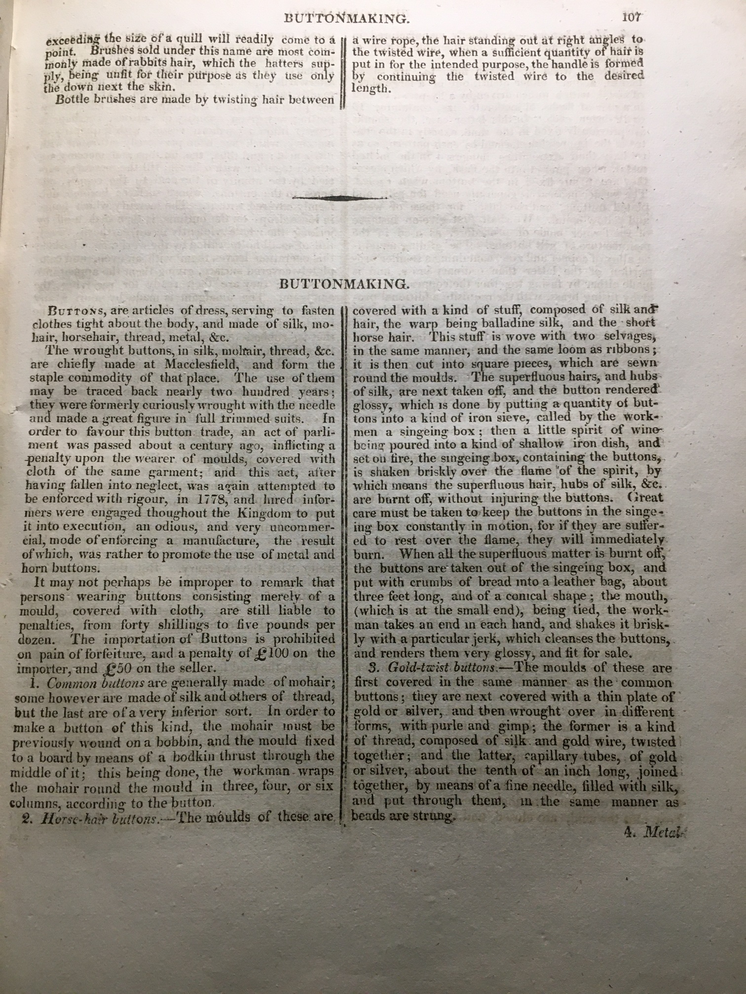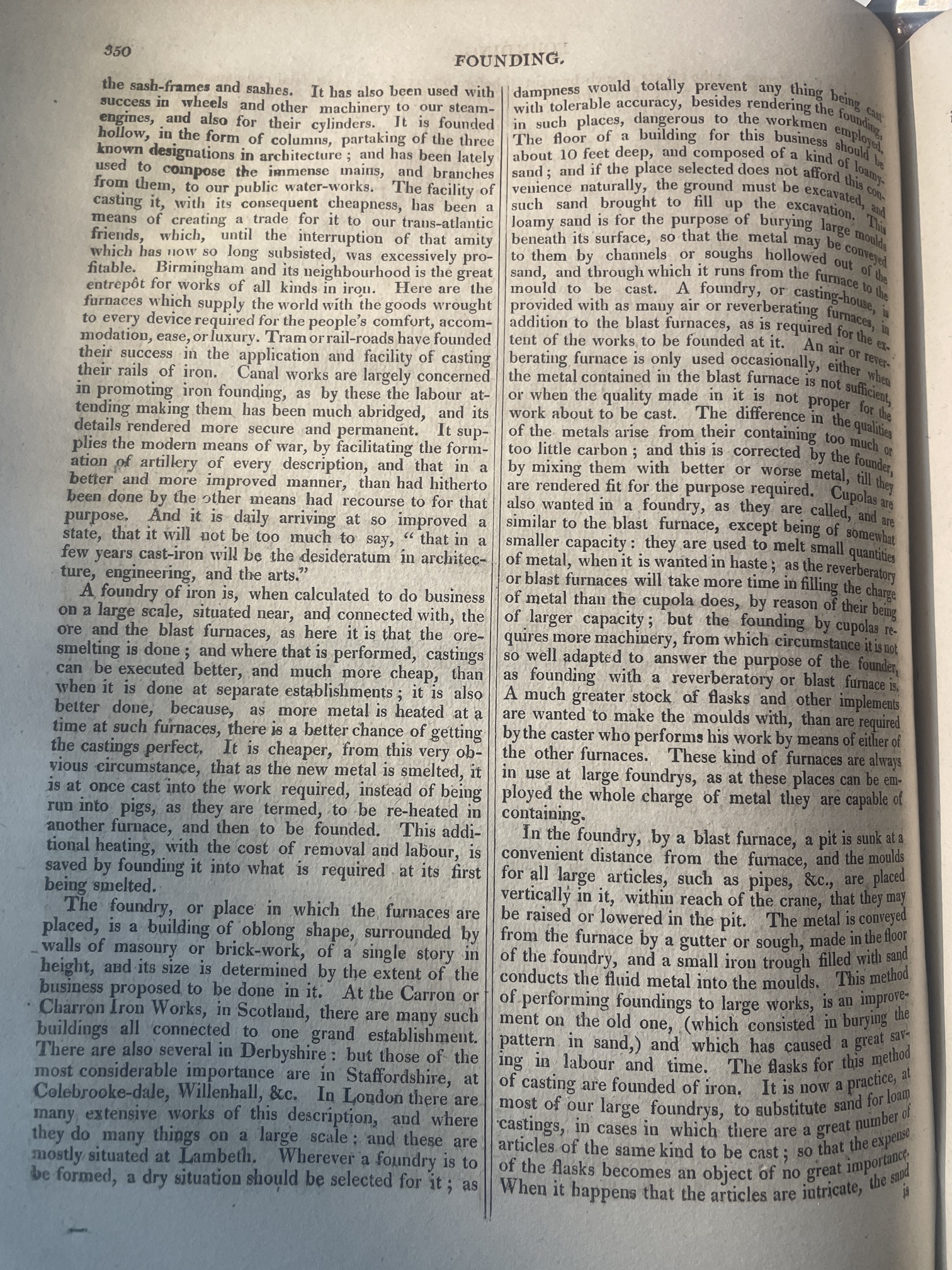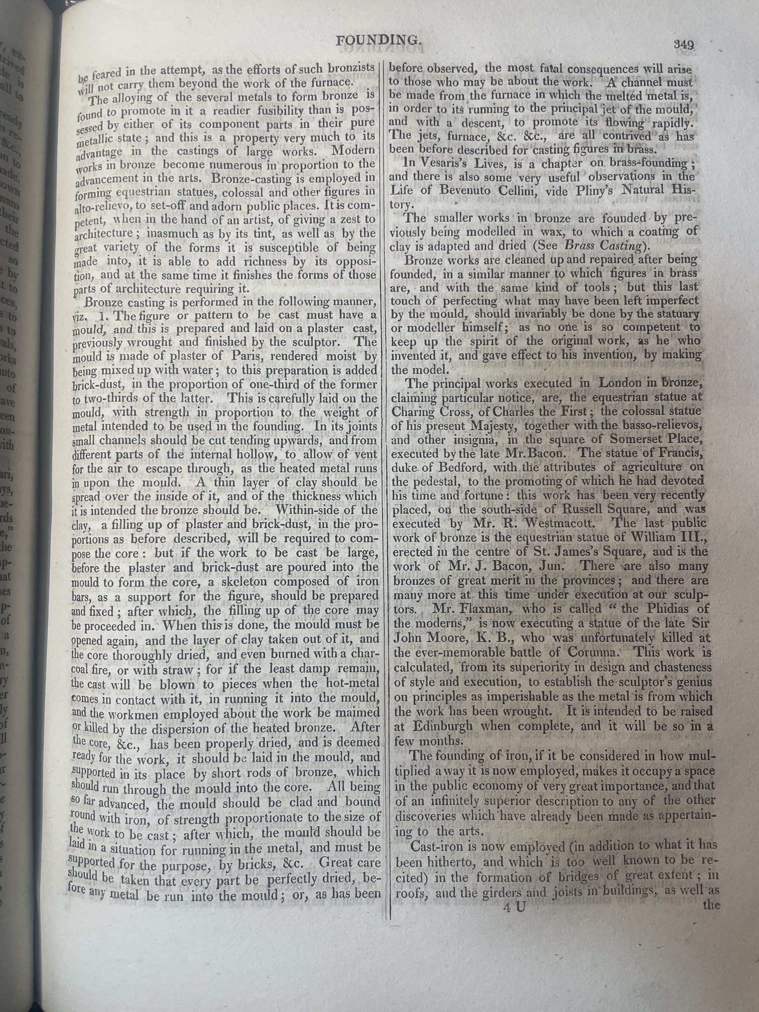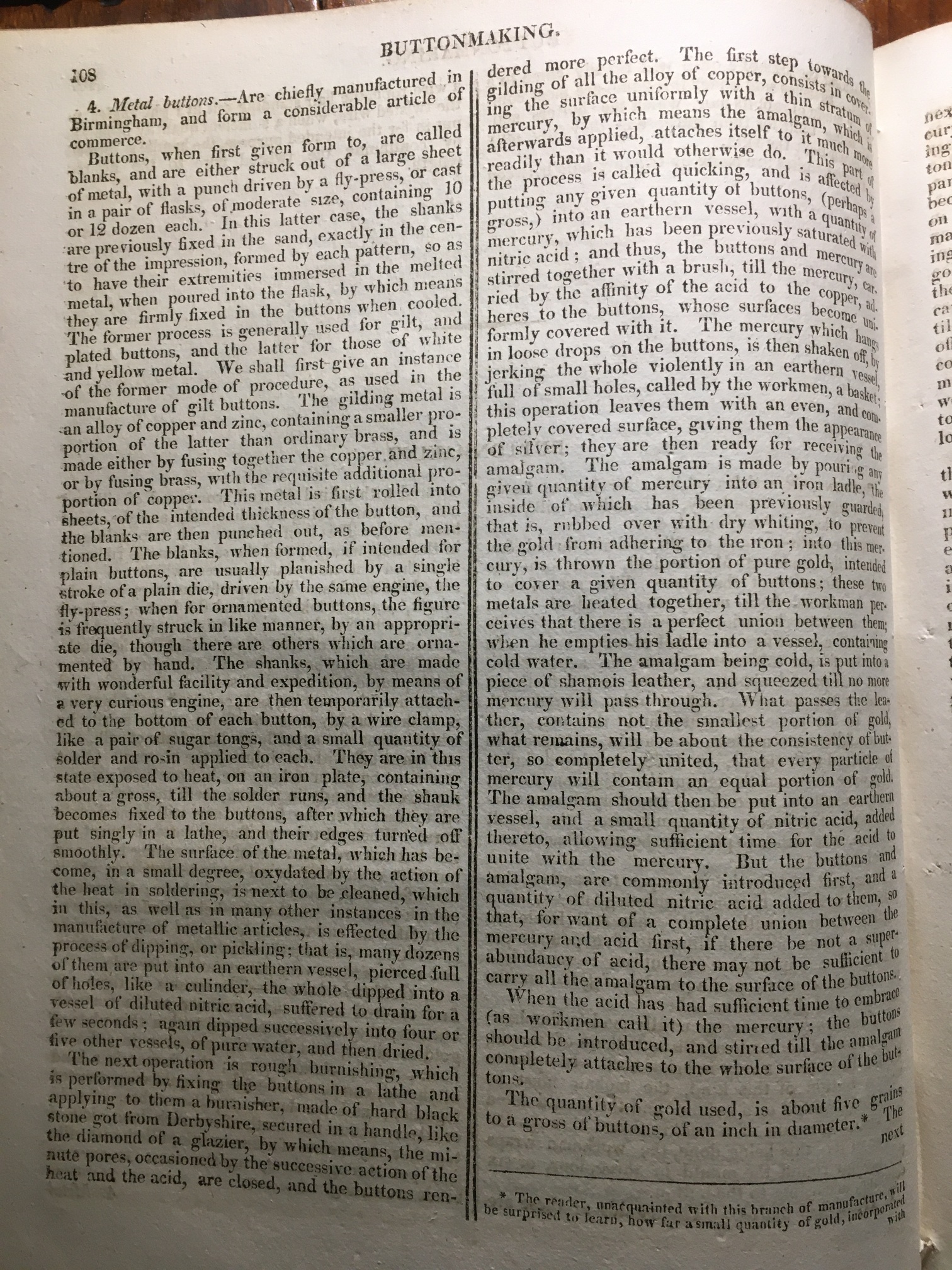 | Description | "The | CIRCLE | of | THE MECHANICAL ARTS; | containing | Practical Treatises | on the various | Manual Arts, Trades, and Manufactures. | ====== | By THOMAS MARTIN, Civil Engineer" ... "LONDON: | PRINTED FOR RICHARD REES, 62, PALL MALL; | Gale, Curtis, and Fenner; and Sherwood, Neeley, and Jones, Paternoster-row; | and W. Curtis, Plymouth. | --- | 1813." Quarter-calf with marbled boards. 616 pages, plus plates. Contents: Architecture Bridges Baking Basket-making Block-making Book-binding Brewing Brick-laying Brick-making Button-making Cabinet-making Carpentry and Joinery Carving and Gilding Coach-making Comb-making Coopering Cotton manufacture Currying Cutlery Dyeing Engineering Enamelling Engraving File-making Founding Glass-making Glazing Gold-beating and gilt wire-drawing Gun-making Hat-making Japanning Masonry Mining Modelling Musical instrument-making Nail-making Needle-making Painting (house) Paper-making Patten-making Pin-making Pipe-making Planing Plastering Plumbery Pottery Printing Rectification Rope-making Sawing Shot-making Slating Soap-making Staining of paper Starch-making Tallow and wax chandlery Tanning Tin-plate-working Turning Watch and clock-making Weaving Wheel-wright Wire-drawing Wool-combing Practical geometry Fire-gilding is covered in detail in the Buttonmaking chapter. "Clock Work" illustrations (of earlier edition?) reprinted in "Horological Shop Tools 1700 to 1900", T.R. Crom, page 215. Topic: brslac photos: 9; Founding: 10-?; Typefounding later in Founding chapter (not shown). |