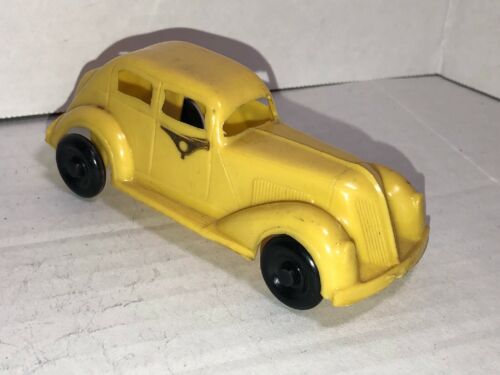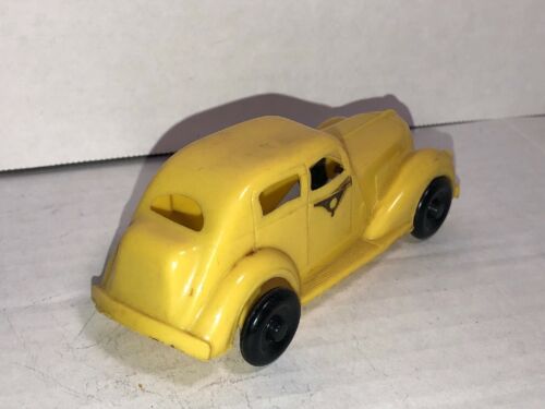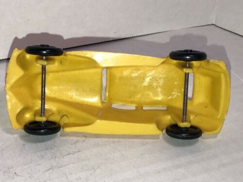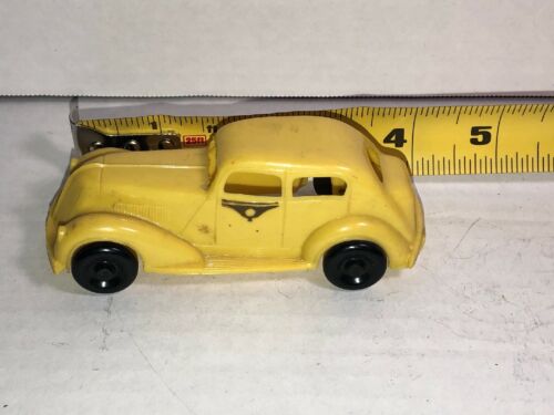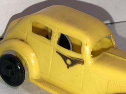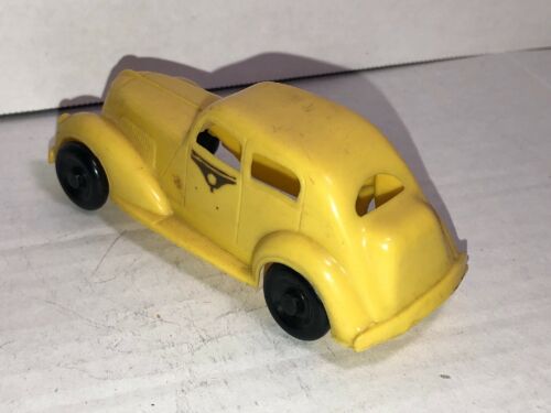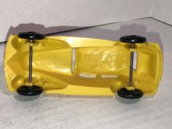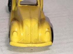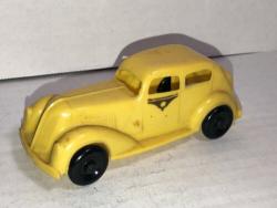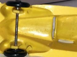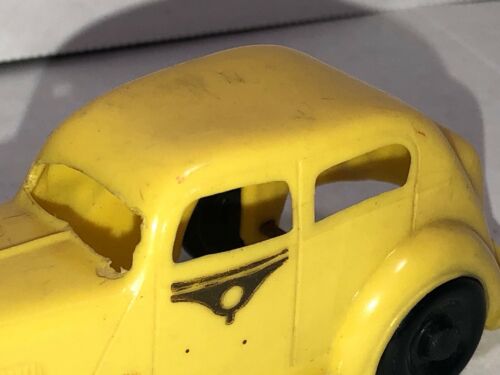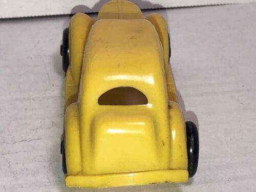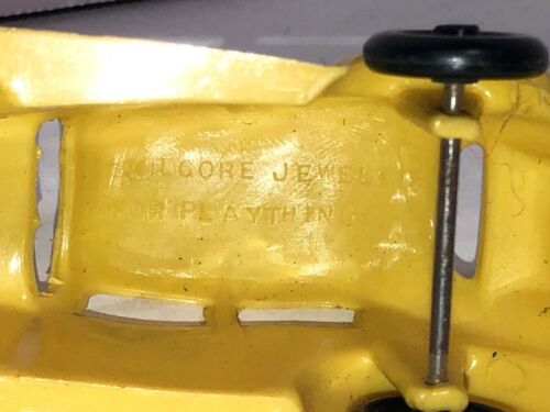 One of the first injection-molded plastic toy cars. Yellow body with black wheels. "MADE | IN U.S.A." and "KILGORE JEWELS | FOR PLAYTHINGS" molded on inside.