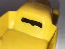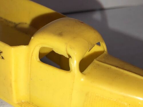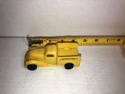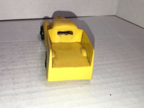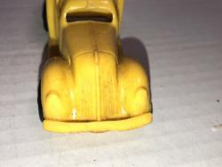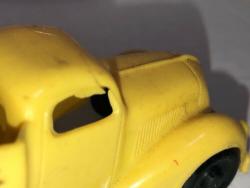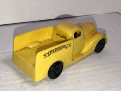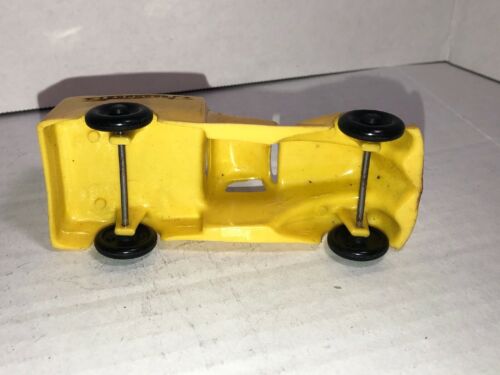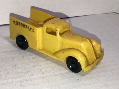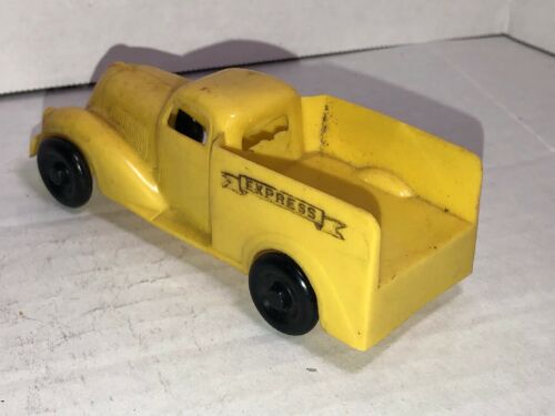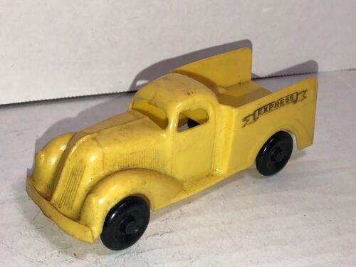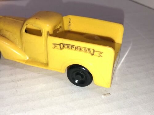 One of the first injection-molded plastic toy cars. Yellow body with black wheels, "EXPRESS" in a banner, molded and printed on the sides. Unmarked on inside.