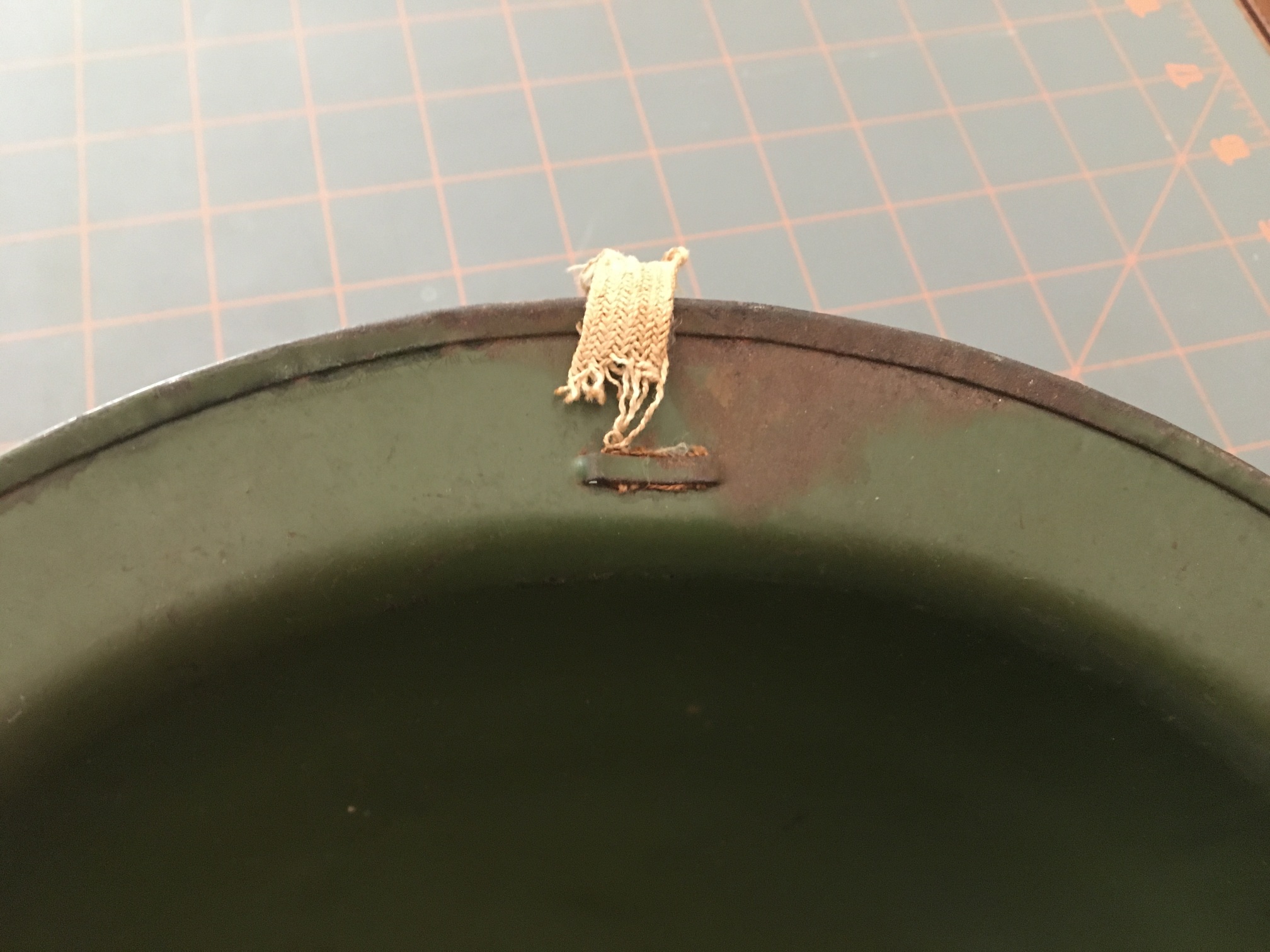 | Description | A child's toy doughboy (Brodie) army helmet, stamped of thin steel and painted green. two slots are cut in each side, with remnants of a woven chinstrap remaining, held by the strip between them. Rim rolled under. Top heavily dented. See Child's doughboy army helmet, single-hole. |