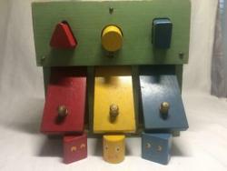 | Description | Very similar to Holgate #905 "Play Cabinet", but a little larger, with the shaped holes in the top of the case, instead of in the doors themselves, and very plain nailed construction (no curves, or dovetails). Also contains two each of the three shapes, and each shape is only in one color, unlike the other cabinet. Partial type 4b deal on top (dt4b). Another, incomplete, sold a few years ago. It had a type 4a decal. Seen in the 1937 catalog (p16). |