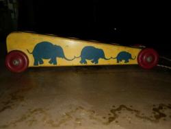 | Description | Early Circus Wagon, with simple elephant theme and thin, contoured red wheels with steel screw hubs. Yellow, with three interconnected blue elephants on each side. About 5% of what appears to be a Type 4b (dt4b) decal on the back. Tri-colored pull string missing the ball. No pegs. Some wear, especially to wheels. This was produced as early as 1936, but I expect it is 1938 based on the decal. |